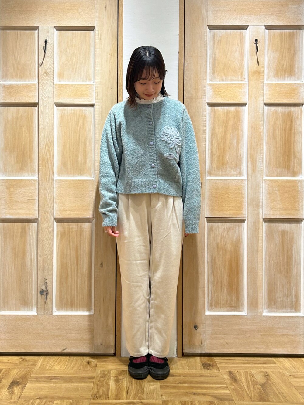 もこもこと柔らかい手触りのカーディガンを着てみました♪ ボタンはくるみボタンになっていて、 ボディ部分より少し明るい配色なので ワンポイントになってかわいいです💫 短丈なのでワンピース合わせてなどでも 大活躍間違いなしです! お花の刺繍が主張しすぎない色だけど パッと目の引くデザインでかわいいです💖