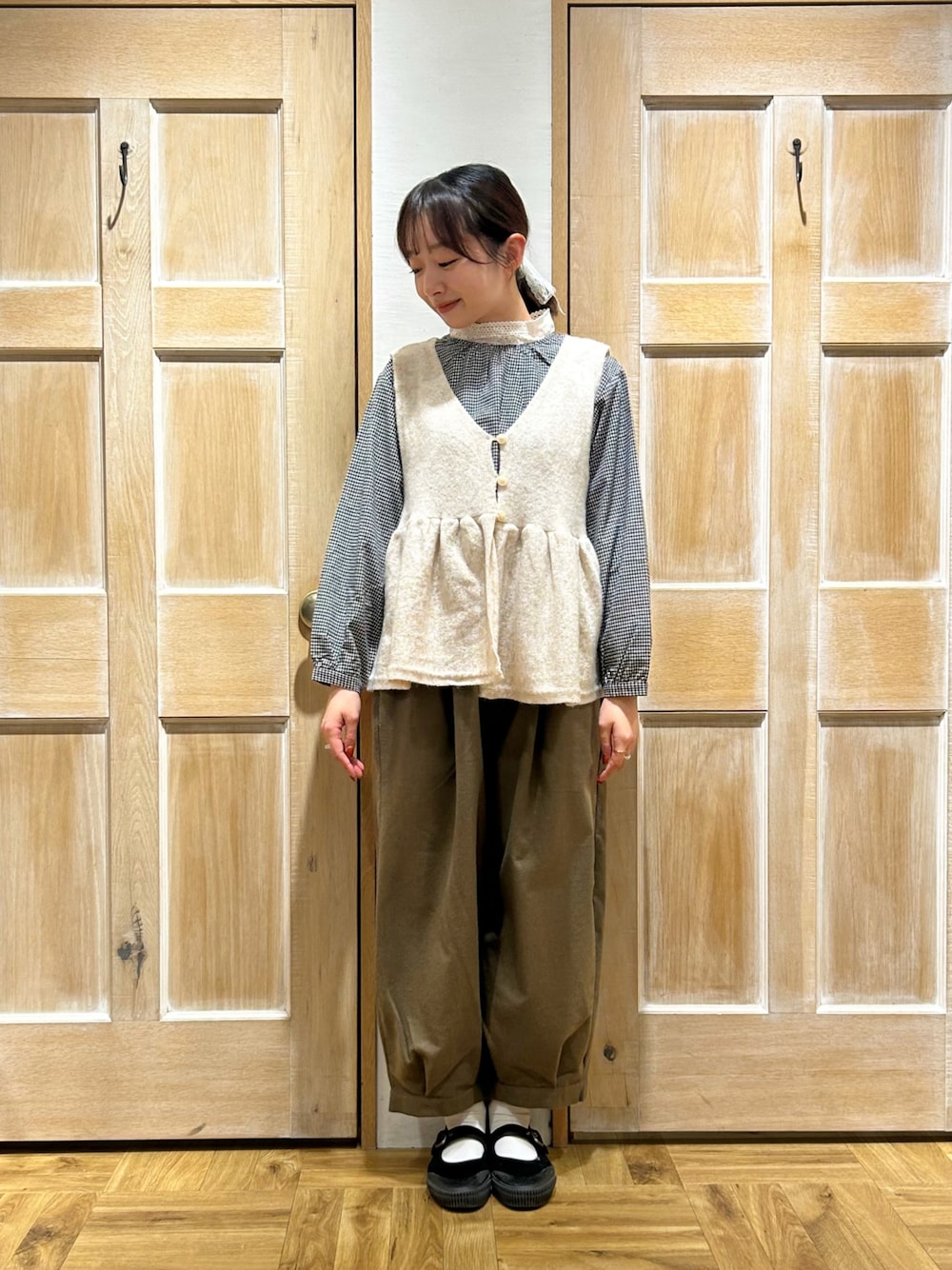 ちえのベスト「Vネック裾フリル前後2WAYニットベスト」を使ったコーディネート