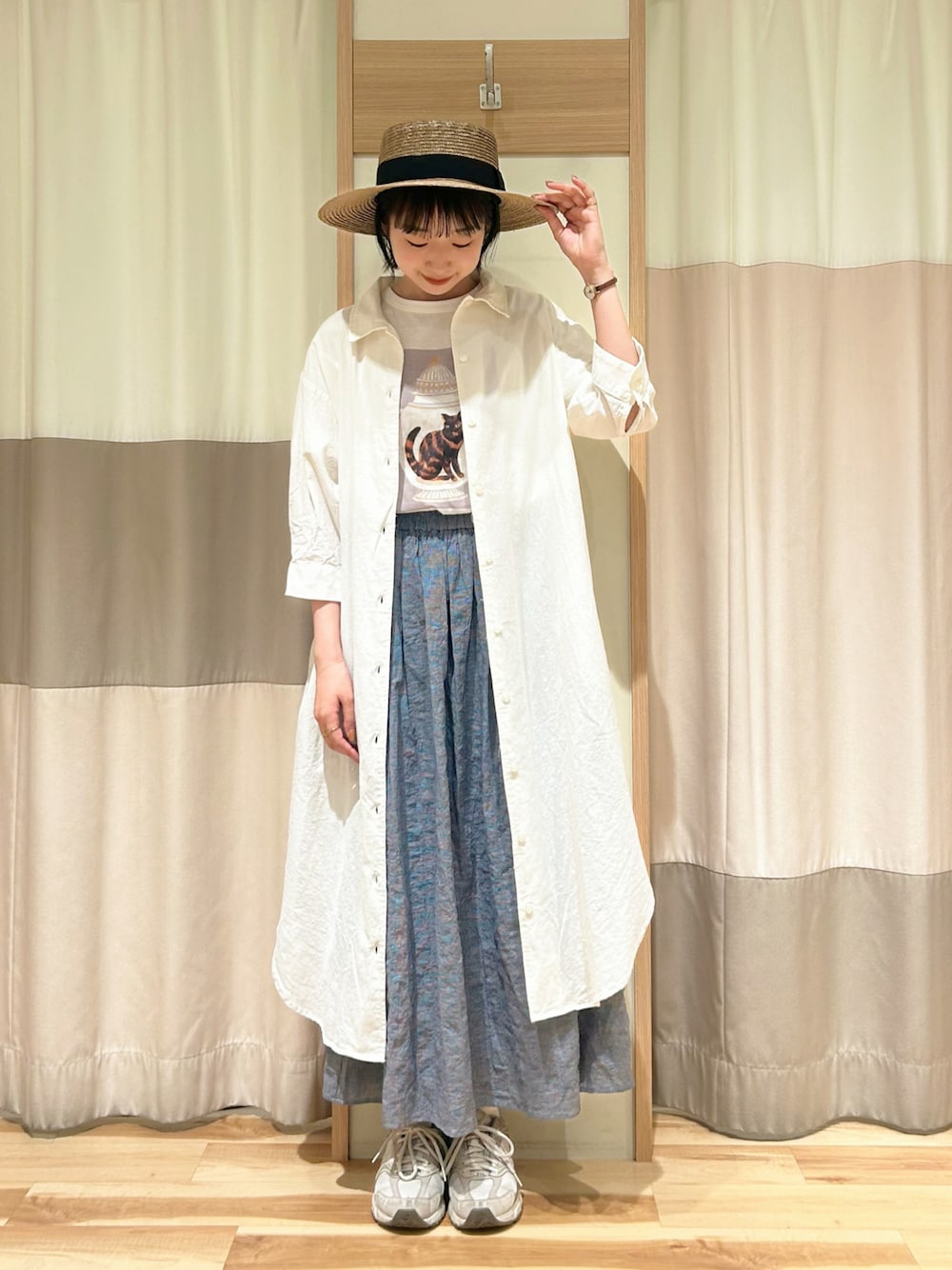 カットソーとスカートにシンプルな ワンピースを羽織ったナチュラルコーデ♪ ワンピースは広がりすぎないシルエット なので、可愛らしくなりすぎない着こなしです!