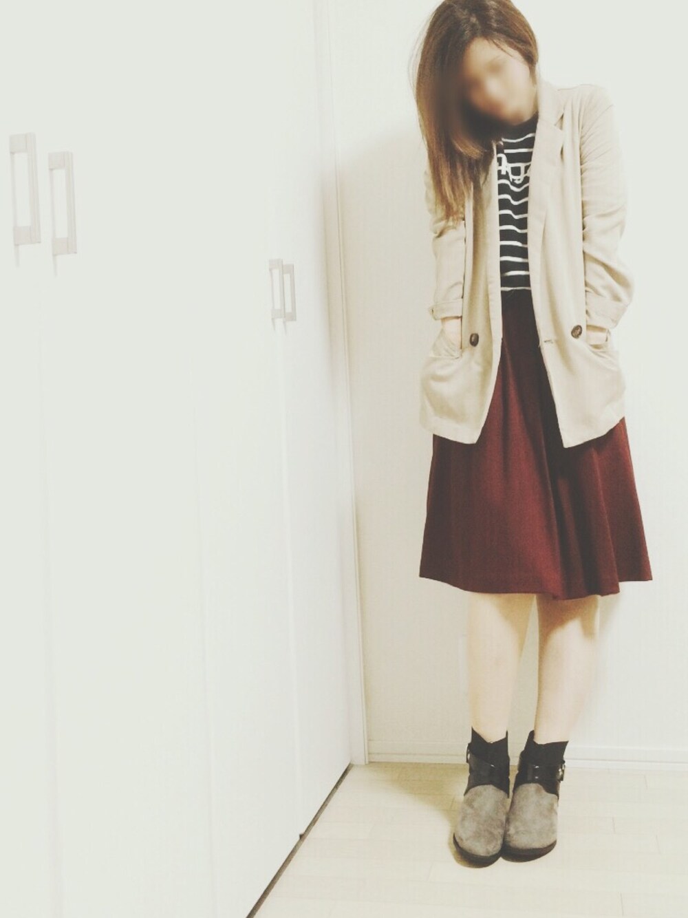 holidayStyle*♬೨̣̥ たまたまボーダー着てたので けんけんから教えてもらった しましま感謝祭参加させていただきます💗 今回のコーデ。 トップ画はテーラード。 久々にGジャンも着てみました🎵(小窓) 中には黒基調のボーダーニット。 ボルドーのスカートはウールで生地が分厚くてあったかい😘 ZARAのショートブーツは切替部分が好き。なんか靴下履いてるみたいに見えますよね。 私、昔から袖をまくったり折ったりする癖があって、どの服も袖部分がすぐにヘロヘロになります😥なるべく萌え袖を心がけよ🤗← さてさて週半ば頑張ります✨ 追伸:やすおちゃん今日誕生日なんだね😌 ひっそりと…おめでとう🎂