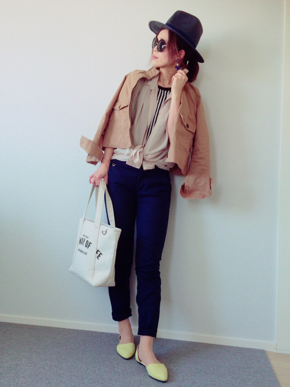 holidayStyle*♬೨̣̥ 今回はベージュのシャツがKBFです。もう10年近く前に買ったものです。透け感シャリ感のある素材でアレンジし易いので今でも重宝してます。OfficeStyleでも春から夏にかけてよく登場🎵このコーデは中のストライプを出したいので、ボタンは留めずに裾を結んでみました😊 さてさて♡ 3日間の大阪の試合観戦も終わり、明日からこれまた3日間のGWに備えて今日はしっかりと仕事納めしてきます💪 あー!早くゆっくり寝た〜〜い❕😪 こんな凡人な私のコーデを見てくれる皆さん。いつもありがとう😌