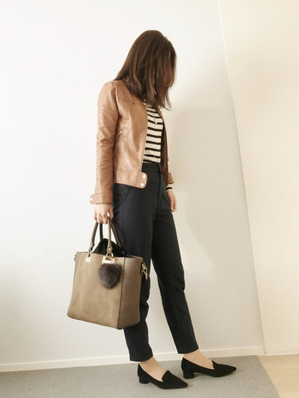 holidaystyle*♬೨̣̥ キャメルのライダースに ボーダー着てネイビーパンツ履きました。 このハラコ生地のパンプスは すっごいお気に入りの一足です😊 今日は息子っちの体育祭です😙 中学の体育祭なんて 旦那はまったく興味がないようなので 友達と見に行ってきまーす♡🎵笑 それではそれでは have a nice day❤︎