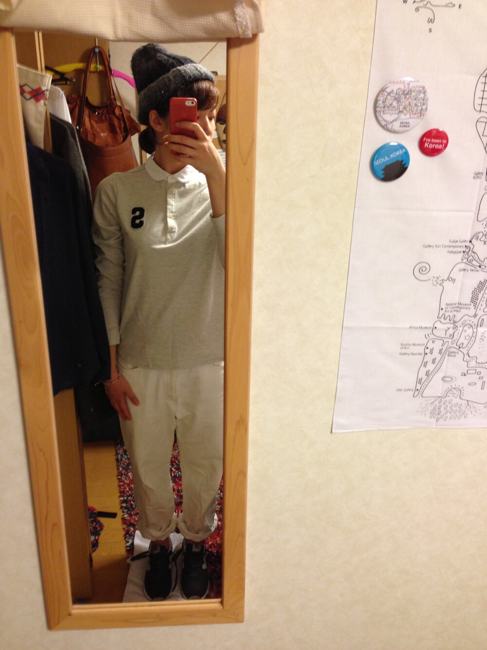 白とグレー。 ニット帽は雑貨屋さんで、 シャツは大好きな通販雑誌haco.で、 パンツはサンキューマートで。 部屋が汚い。