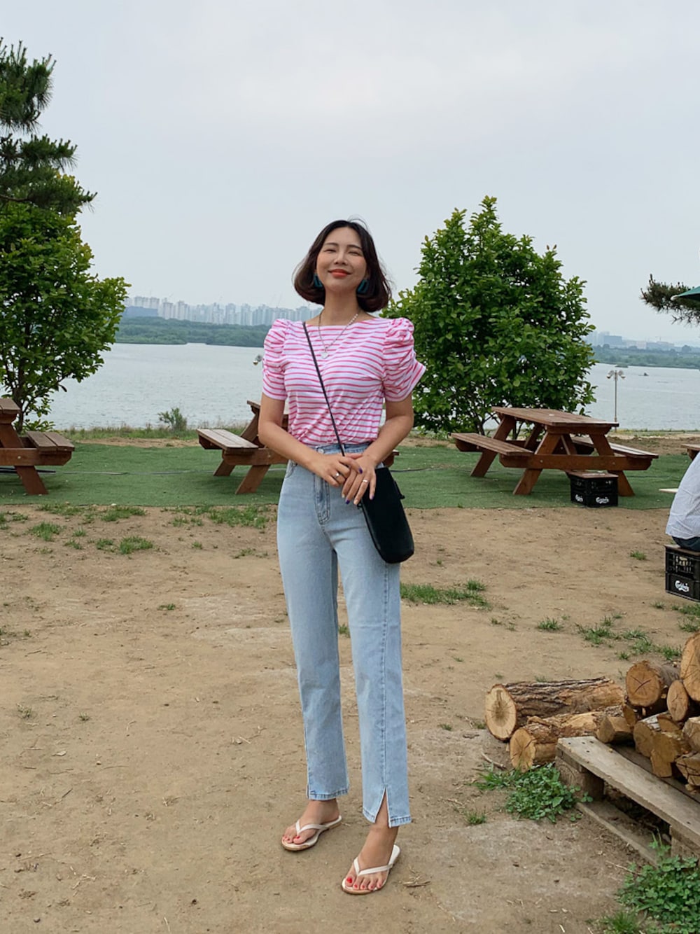 カジュアルでありながらも、 ガーリーで華やかな夏のコーデ♥ シャーリングを施したパフスリーブとボートネックデザインが 女の子らしさは残しつつボーダーパターンがカジュアルなムードを演出してくれるトップス + シンプルかつスタイリッシュなポイントのあるデニムパンツ 新規会員登録+LINEお友達追加で最大1000円割引イベント進行中♥ 新作アイテム24時間10%割引も! http://bitly.kr/Zc3rbF