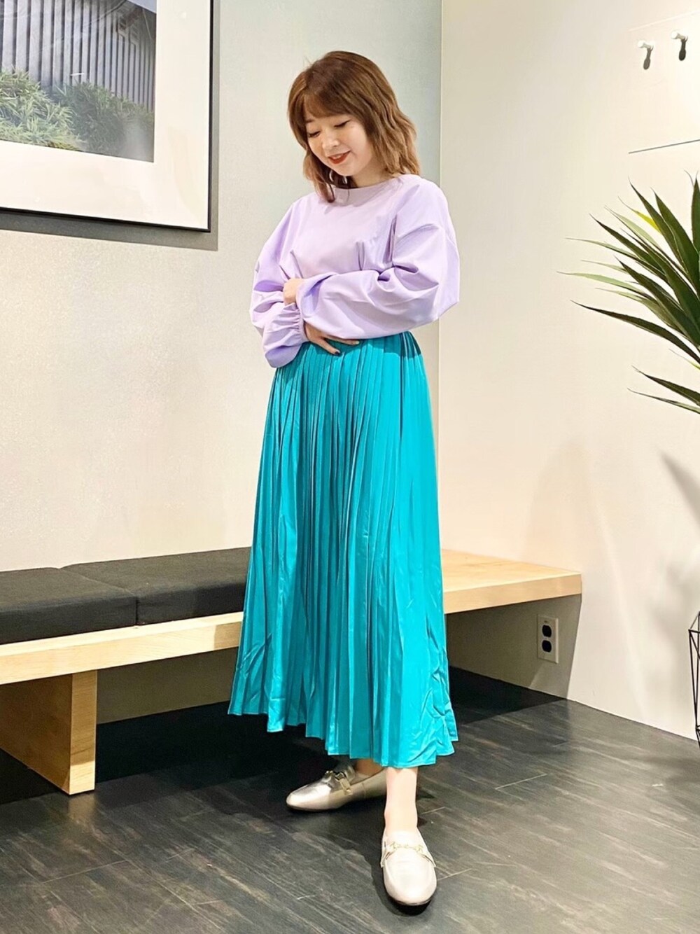 コーディネート閲覧いただきありがとうございます! 近頃どんどん寒くなってきますが みなさんいかがお過ごしですか? なかなかお出かけできませんが 気分だけでもアリエル意識のコーデ💜💚 パープルのトップスに エメラルドグリーンのプリーツスカート🧜♀️