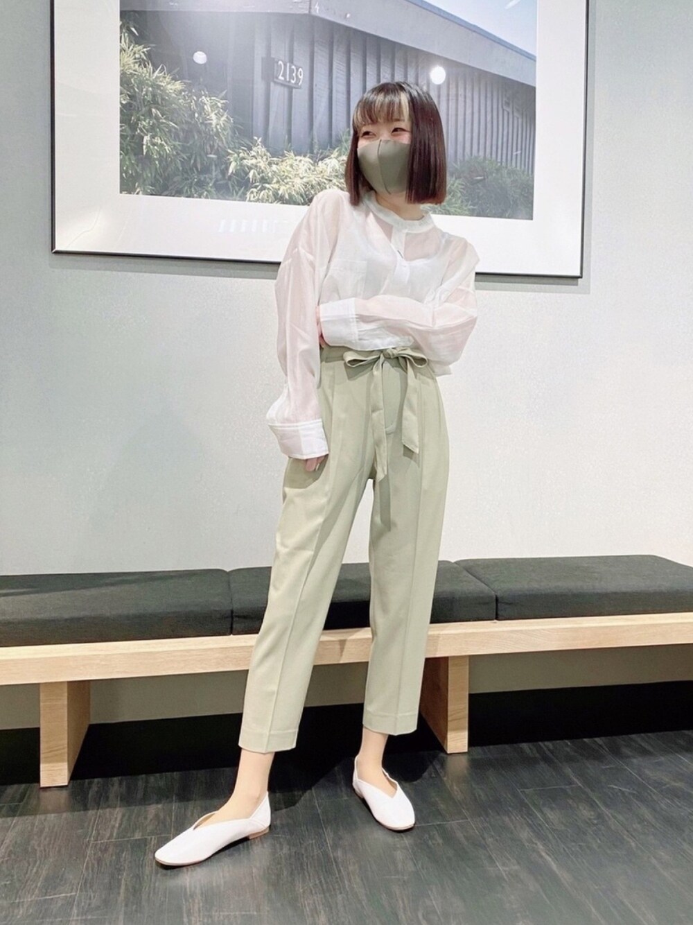 閲覧いただきありがとうございます😊 シアーシャツが春らしいアイテム🌸 そして低身長向けのパンツ! ボトムスも春らしいグリーン💚 リボンは取り外しできます!