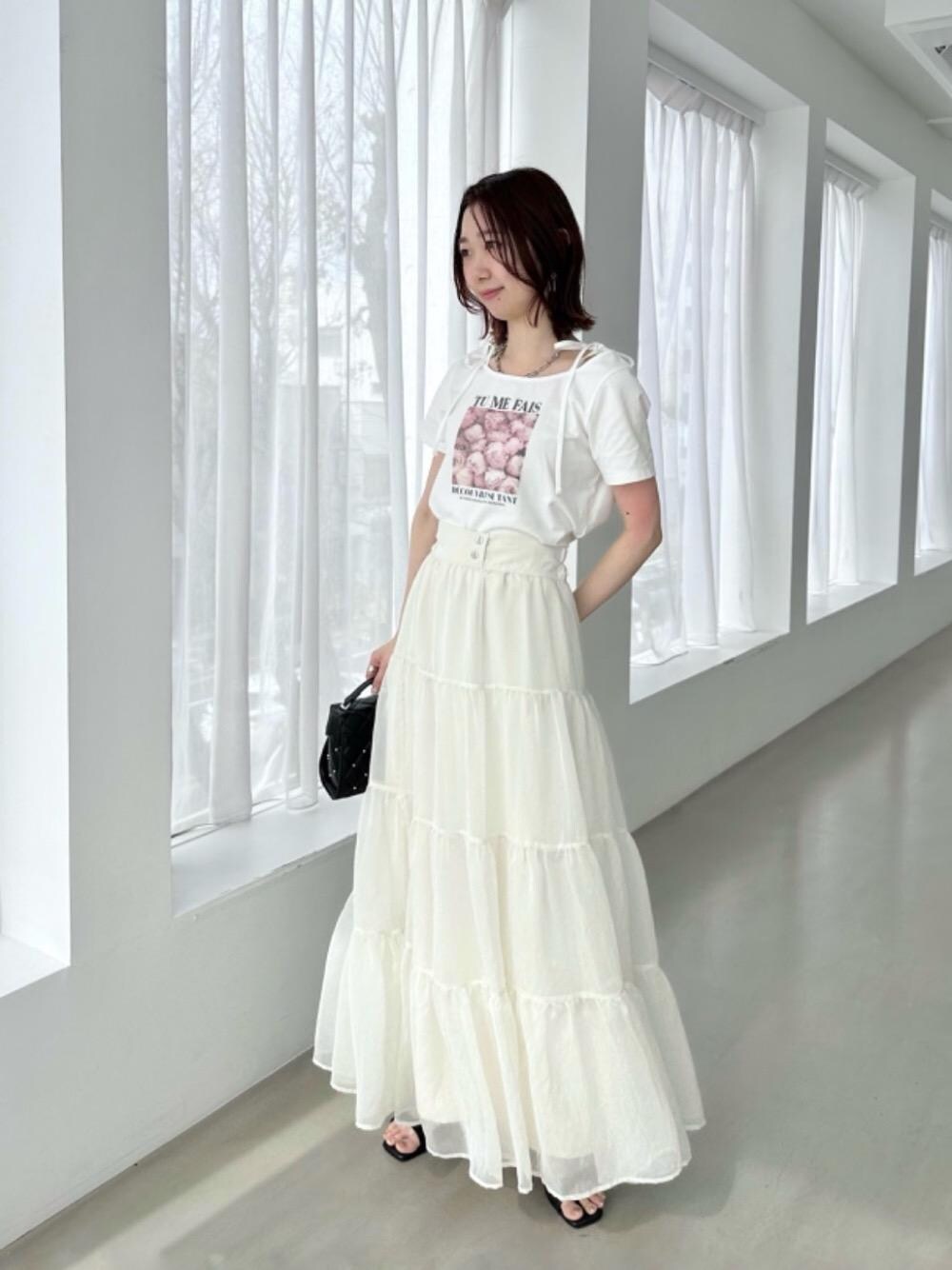158cm / 骨格ウェーブ / ブルベ夏/普段サイズM/普段シューズサイズ23.5cm 【ロマンティックメッセージリボンT】 メッセージにリボンの付いたロマンティックなTシャツ♥ 1枚で映えるのでシンプルなコーデでも主役になります! sourire angle : 天使の笑顔 【シアーボリュームティアードスカート】 くるぶしくらいの長め丈。ウエストは後ろがゴムゆとりがあります。 ボリュームがあるのでショート丈やコンパクトなトップスがバランス取りやすいですが、生地が柔らかいので、ミディ丈のものとも◎ 【クリアビジューヒールリボンサンダル】 お客様にデザインをアンケートで相談してできたサンダル💡 華奢なリボンとキラキラヒールがかわいい♥ ミュール見えするけどストラップでしっかり足が固定されるので歩きやすいです。サイズはいつものサイズで大丈夫でした! 【パールキルティングバニティバッグ】 お財布・スマホ・リップ・ミラーなど見た目の割に容量のあるバッグです♡