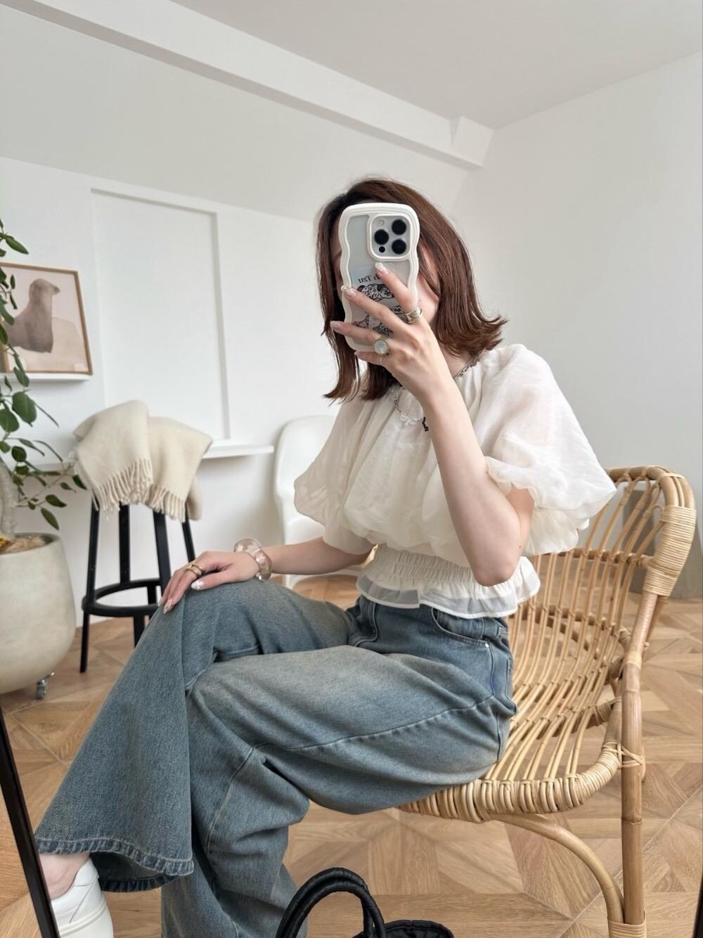 158cm / 骨格ウェーブ / ブルベ夏/普段サイズM/普段シューズサイズ23.5cm 【前後2wayバルーン袖ブラウス】 前後2wayなだけじゃなく、首元のリボンの結び方で色んな着こなしが楽しめる♥ 丈は短めなのでさりげない肌見せするのがかわいい♡ ボリュームの出る方を前にして、リボンを後ろで結んでいます。 【ワイドストレートデニムパンツ】 USEDぽい加工感がお洒落見えするデニムパンツ♥ 全体的にゆるっとしていて、お尻〜腰周りもカバーしてくれます! ルーズ感がある分、少しヒールのあるサンダル合わせがおすすめ◎ 【プレート厚底スニーカー】 ボリュームのあるソールが可愛いし足が盛れる♥ プレートは取り外しできます! 厚底2wayスニーカーよりは横幅がよりフィットしているように感じました◎