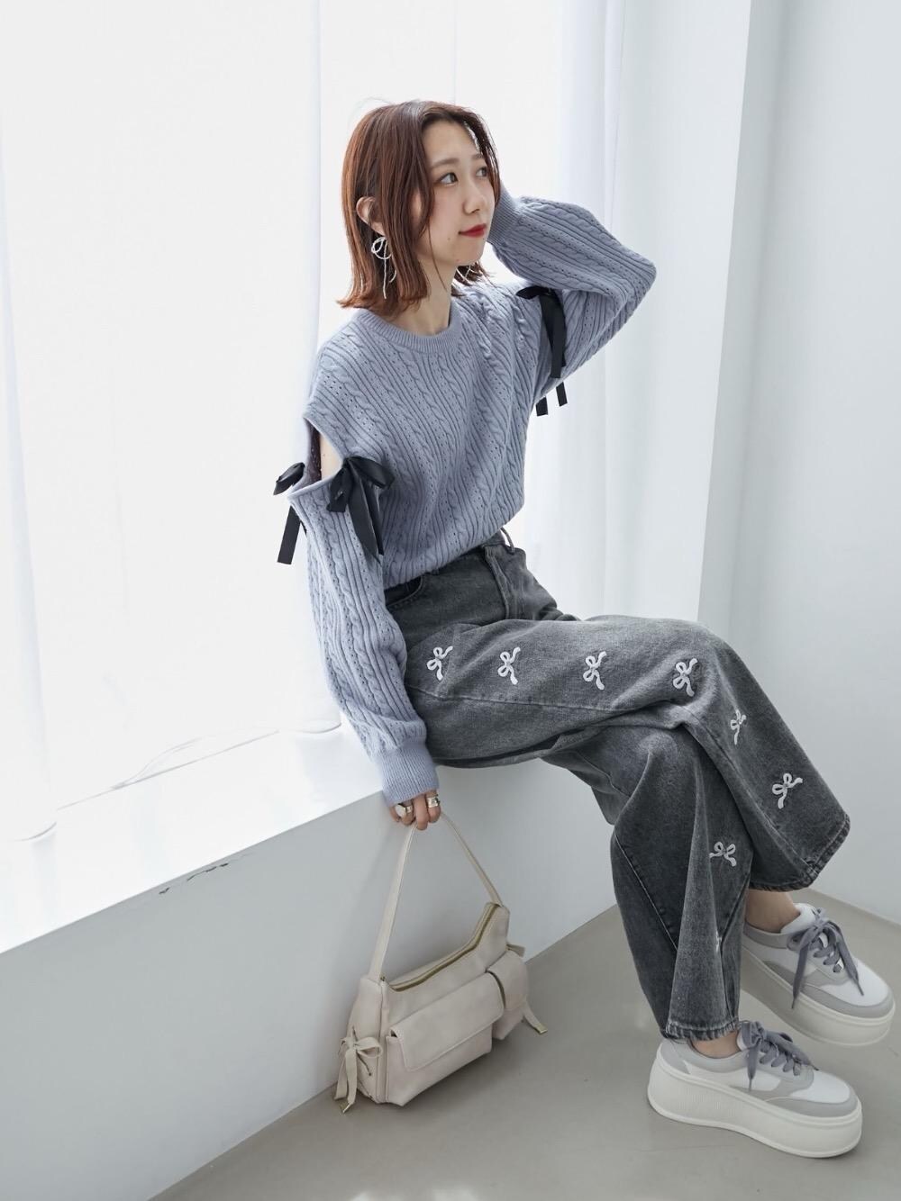 158cm / 骨格ウェーブ / ブルベ夏/普段サイズM/普段シューズサイズ23.5cm 【ロマンティックケーブル肩あきニット】 毛足は長くない生地で、肩のリボンがロマンティックな雰囲気に♡ さり気ない肌見せが可能で、季節が進むと中にレースのインナーを合わせても可愛い! 丈は短すぎないけどすっきりはしているのでアウトでも着られます。 【リボンビジューデニムパンツ】 リボン刺繍がかわいいデニム♥ リボンアイテムの中でもカジュアルなデザインで、さりげなくトレンドのリボンを取り入れられる! 後ろはゴム仕様で着心地楽チン♪ 丈はぺたんこでも引きずらないくらいのすっきりめ! 【プレート厚底スニーカー】 ボリュームのあるソールが可愛いし足が盛れる♥ プレートは取り外しできます! 厚底2wayスニーカーよりは横幅がよりフィットしているように感じました◎ 【アンニュイレースアップバッグ】 お財布・スマホ・ポーチと必需品は全て入ります◎外側にポケットがあるので、小さいものを入れても見失わない! 程よいサイズ感でお出かけにぴったり!