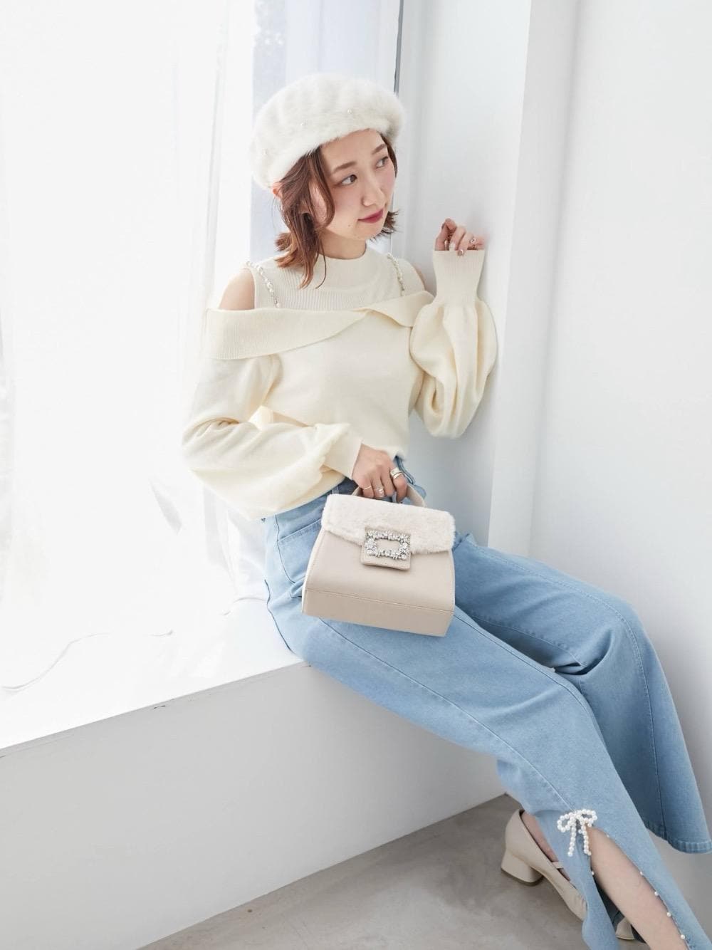 158cm / 骨格ウェーブ / ブルベ夏/普段サイズM/普段シューズサイズ23.5cm 【2wayパールチェーン肩あきニット】 人気のニットが復刻❣華やかなパールチェーンと程よい肌見せで女っぽさを演出してくれます♡お袖が少しぽよんとしたシルエットなのも可愛い! インしやすい長さで様々なボトムスと相性◎ 【パールスリットデニム】 デニム×パールリボンに一目惚れ♥なデニムパンツ。 足が綺麗に見えるシルエットも健在!バックスタイルも綺麗に見えて、脚が盛れます✨ サイズ感は程よくフィット、158cmでちょうどよい丈でした! 【レディギャザーストラップパンプス】 いつも通りMで大丈夫◎ ギャザー部分は柔らかく足を包み込んでくれるので、フィットするのに窮屈感のないデザインです♡ストラップは調節可能。 【ビジューバックルバッグ】 ビジューのバックルがかわいい♥ おでかけの必需品は入ります◎ ※最後にカバンの中身の画像があります。