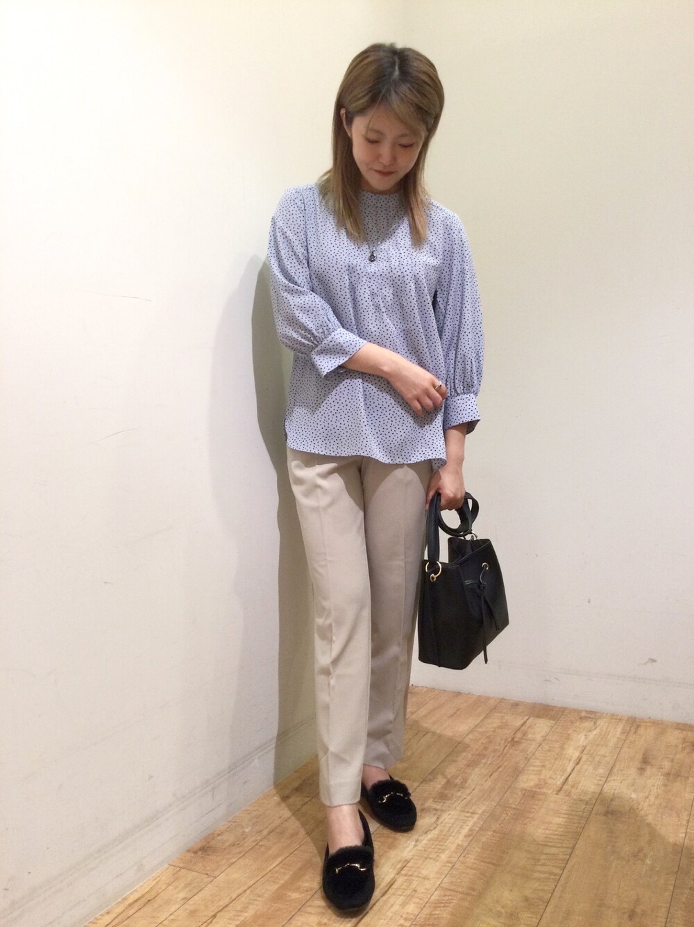 【低身長コーデ】◆藤本美貴さん着用アイテム◆ #dreskip9 軽い着心地でお仕事着としても◎ デザインもシンプルで首回りのフリルが女性らしく ちょっとしたお出かけにも良いです^ ^ もっと寒くなってきた時には ニットと合わせ着るのも良いと思います♪