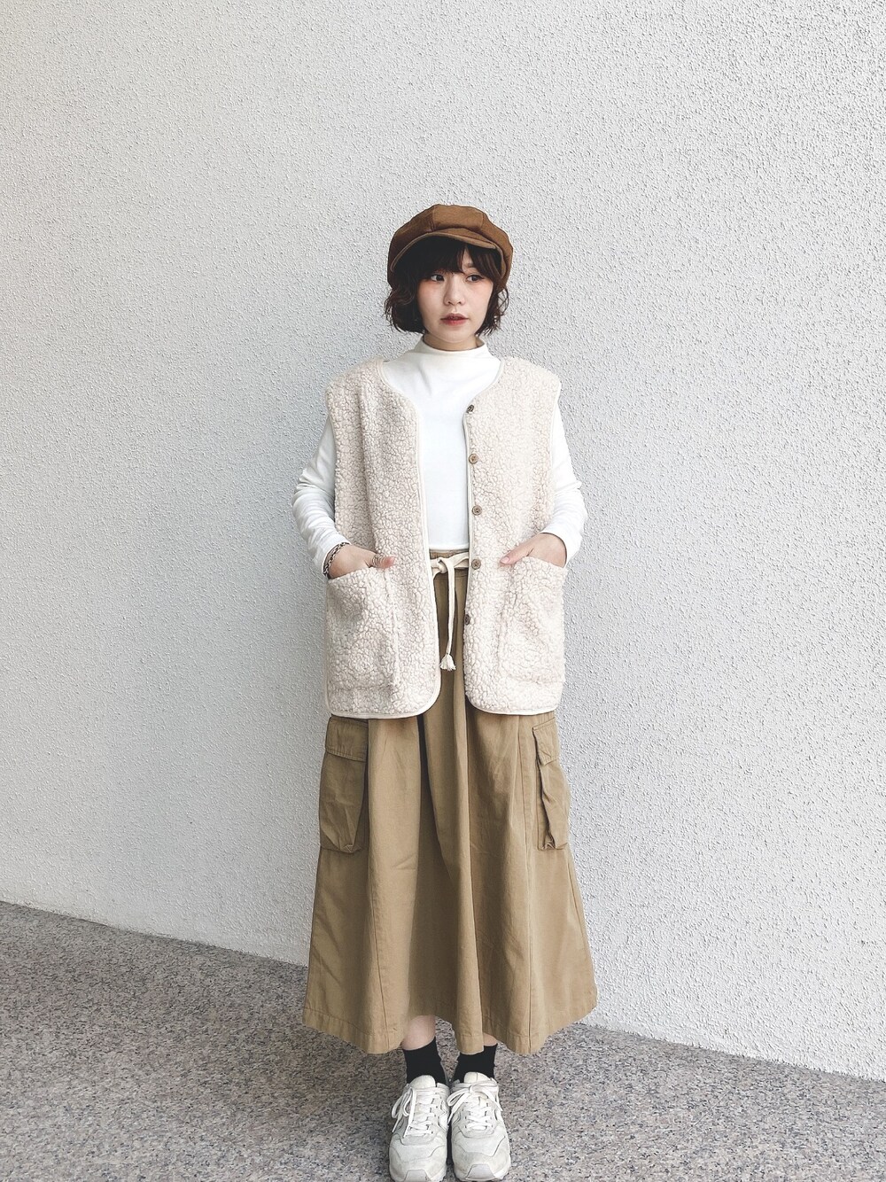 ホワイト系のシューズを着用したレディースの冬コーディネートの1枚目の写真