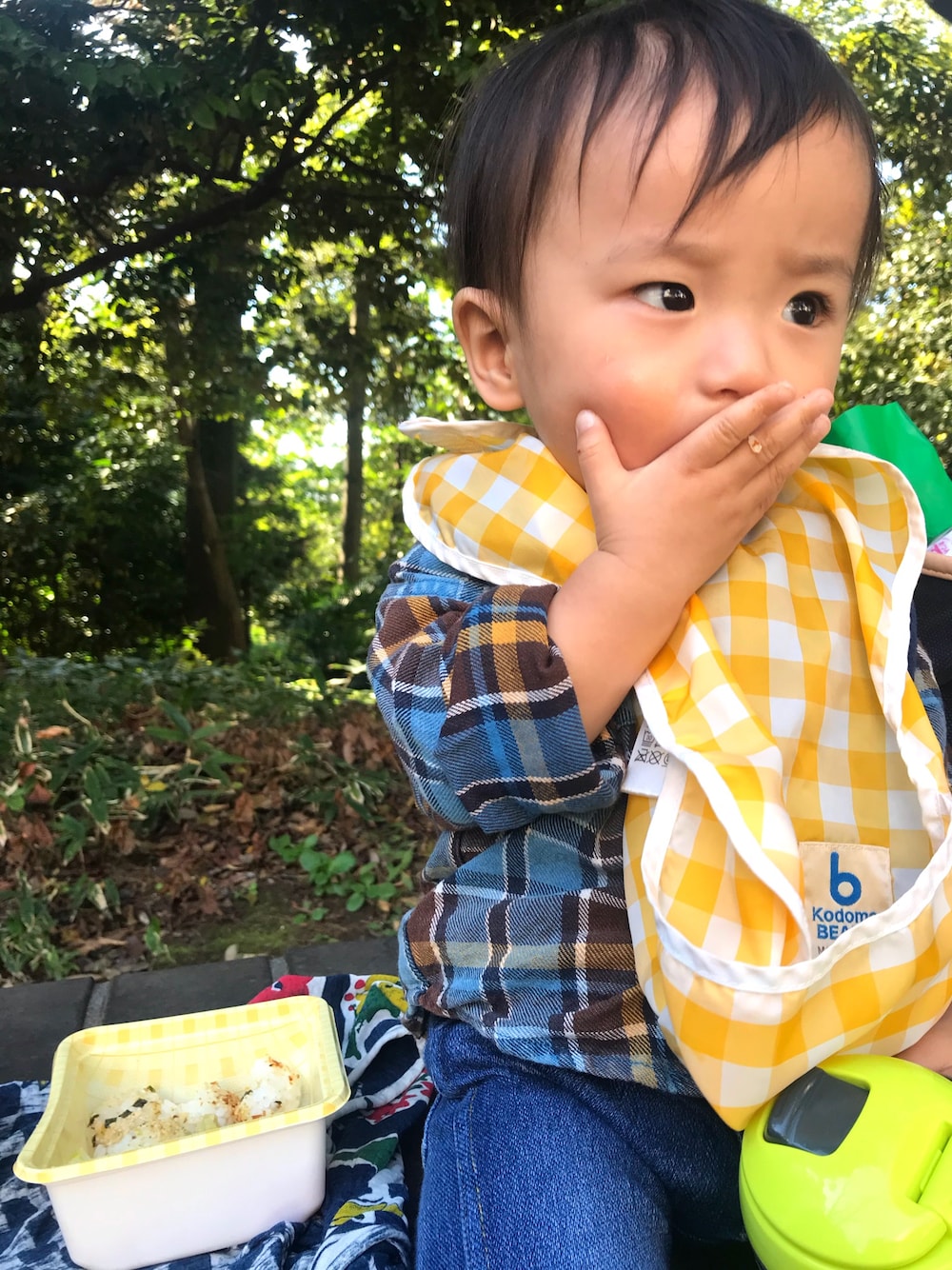 大学の文化祭に行きました。 アカペラ発表をみてノリノリのはる坊でした。 写真は発表の合間に外でおにぎりを食べる坊。 こどもビームスのスタイはママが産休前にお客様から頂いたもの。大切に使っています。