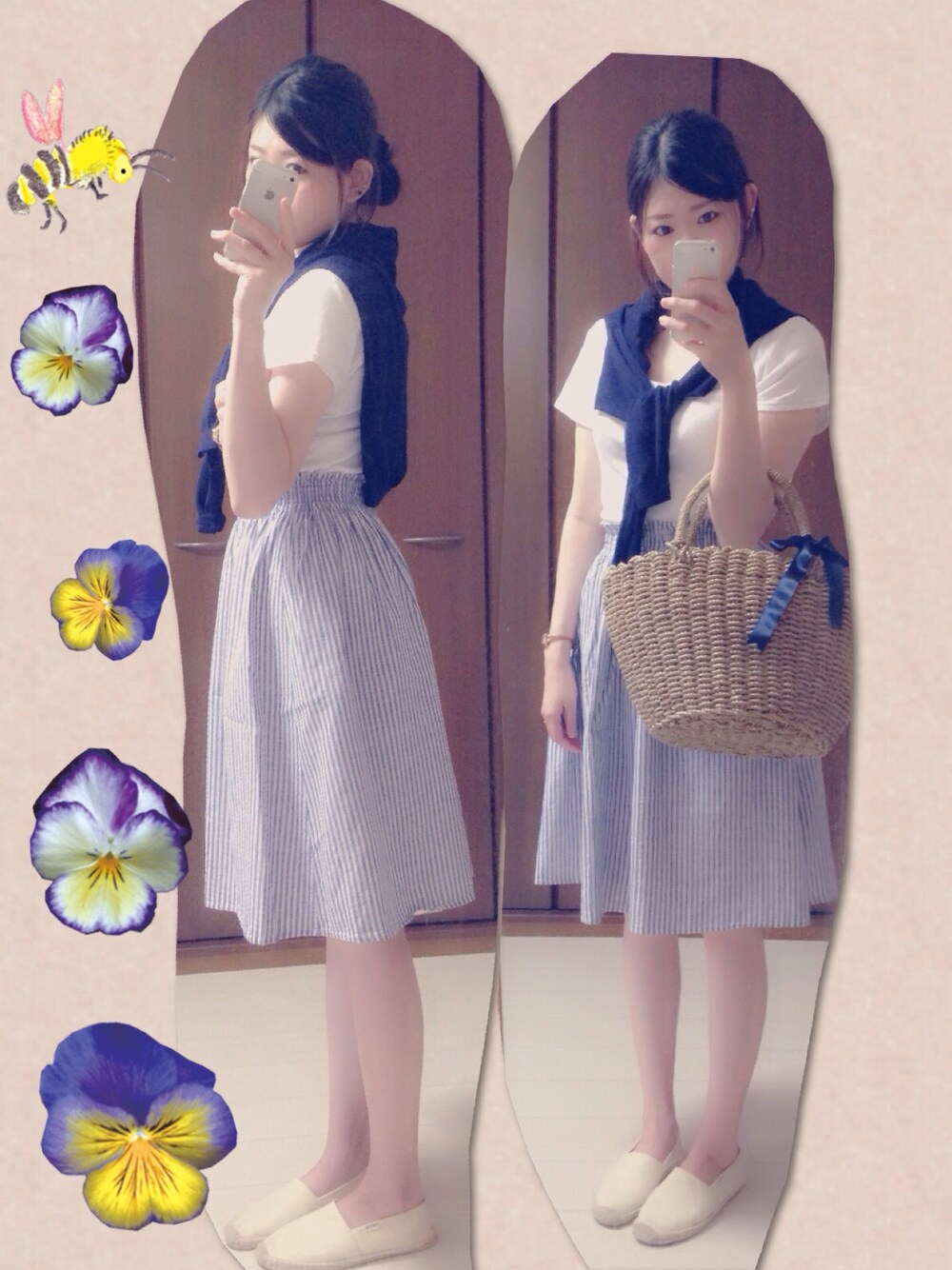 カゴバックに合わせてコーデ ´◡` 今年はおおきめのカゴバックで♡ 荷物たくさん入るから便利◎ ストライプのスカートもお気に入り♡