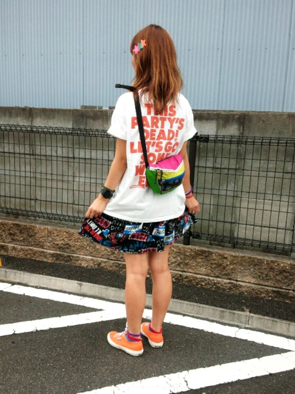 塾に送って行く途中で、撮影しあいっ子笑 今日は、あいにくのお天気...ちょうど出る頃にパラパラと降りはじめたんだけど、写真撮る時だけ、何故かやんでました~(^^♪ 今日もタンクワンピと重ね着です!! このRNAのタンクワンピも、かなりの使い回しができるので、色違いで持ってます♡ バックプリントのオレンジとスニーカーのオレンジを合わせてみました~☆