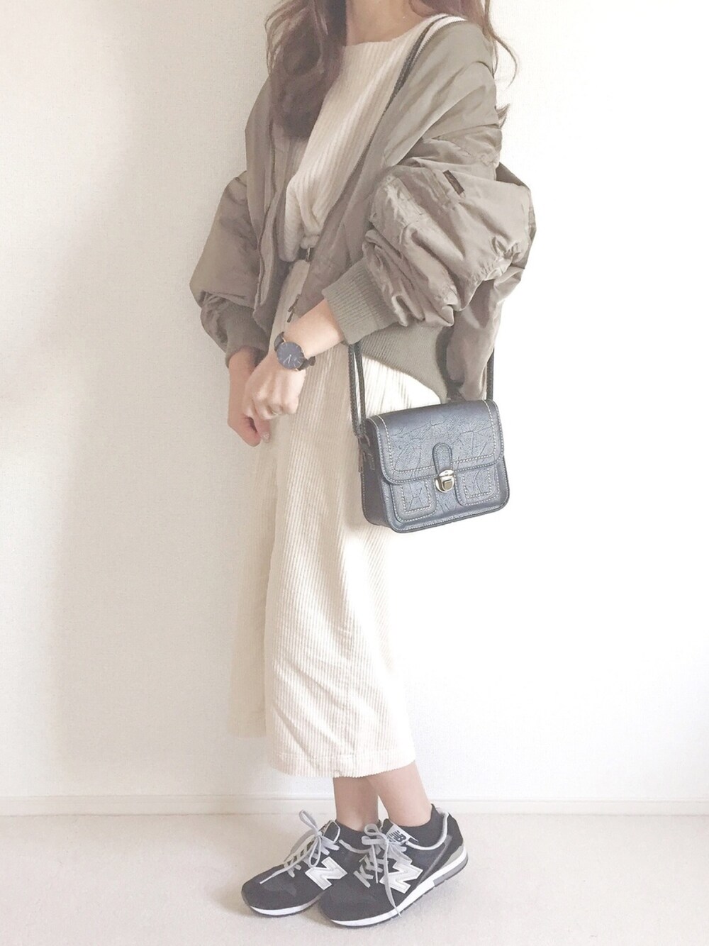白のコーデュロイスカートと 白ニットでセットアップ風☺️💓 背景と同化していてすみません😭 小物系は黒にしてぼやっと しないようにしました( ﹡ˆᴗˆ﹡ )❤