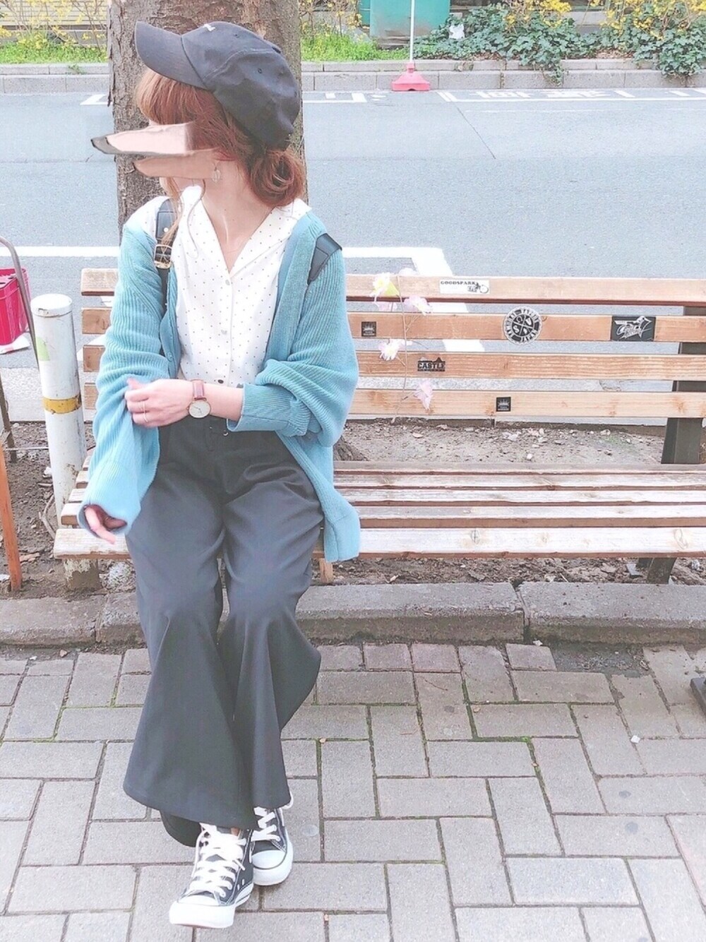 珍しく色物を使ったお花見コーデ🌸 KBFのカーディガンはゆったりしていて 水色がきれいでお気に入りです☺️💓 後からの図も小窓に載せているので よかったら見てください❤❤
