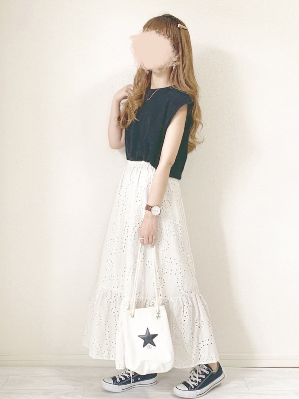 コットンスカート着回し最後は 夏を先取りしたコーデ♡ ブラックのTシャツ合わせは 絶対やりたかったやつ🥰🥰