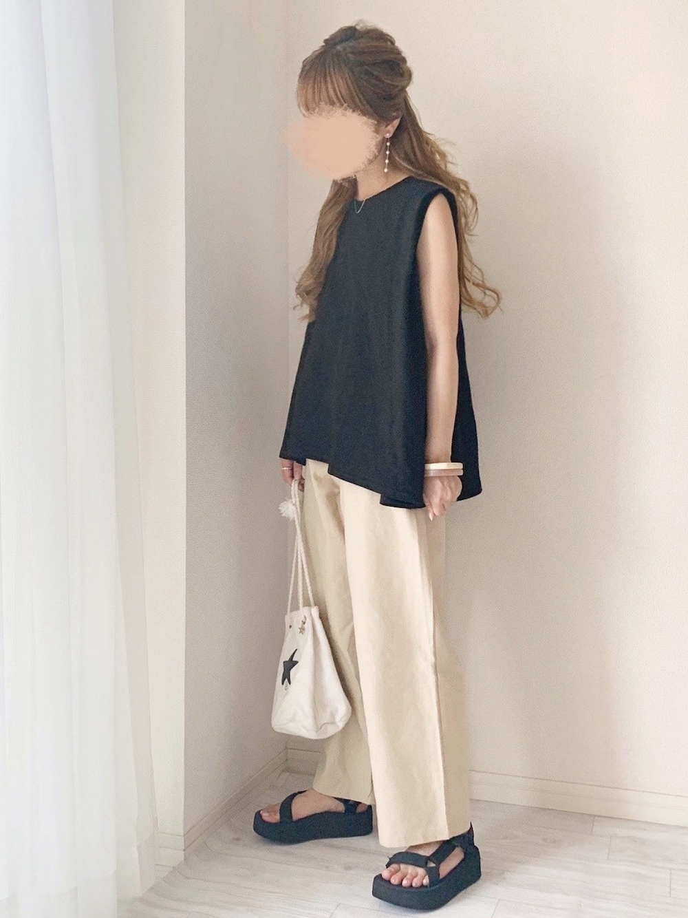 ブラック×ベージュコーデ♡ トップスは二の腕細く見せてくれる デザインでお気に入り🥰🥰 今日再販してます🍫💕
