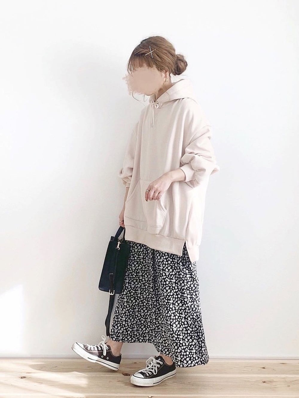 オーバーサイズのパーカー♡ サイズ感がかわいい🥰🥰 柄のスカートと合わせました🙆♀️