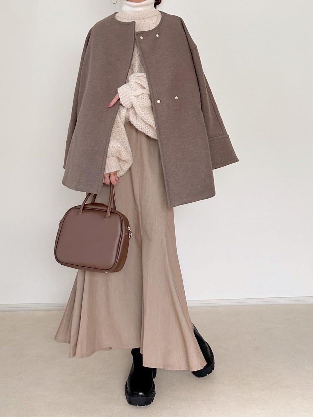 chocoのノーカラーコート「お上品ミドル丈トッパーコート」を使ったコーディネート