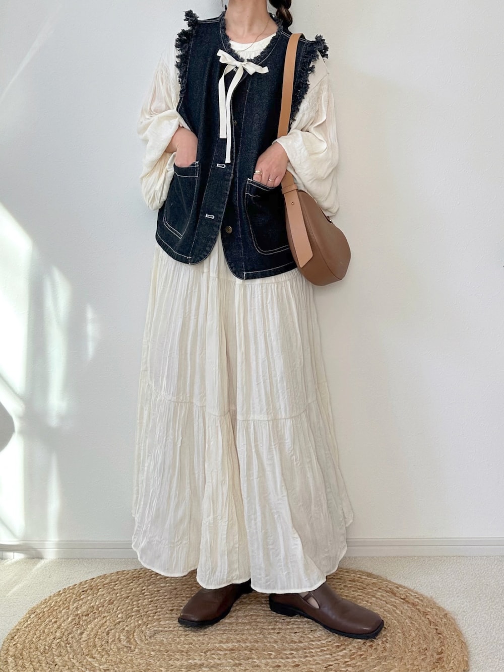 chocoのワンピース「ワッシャーティアードボリュームワンピース[高身長サイズMT/低身長サイズXS,S有り](一部ペチスカートセット)」を使ったコーディネート