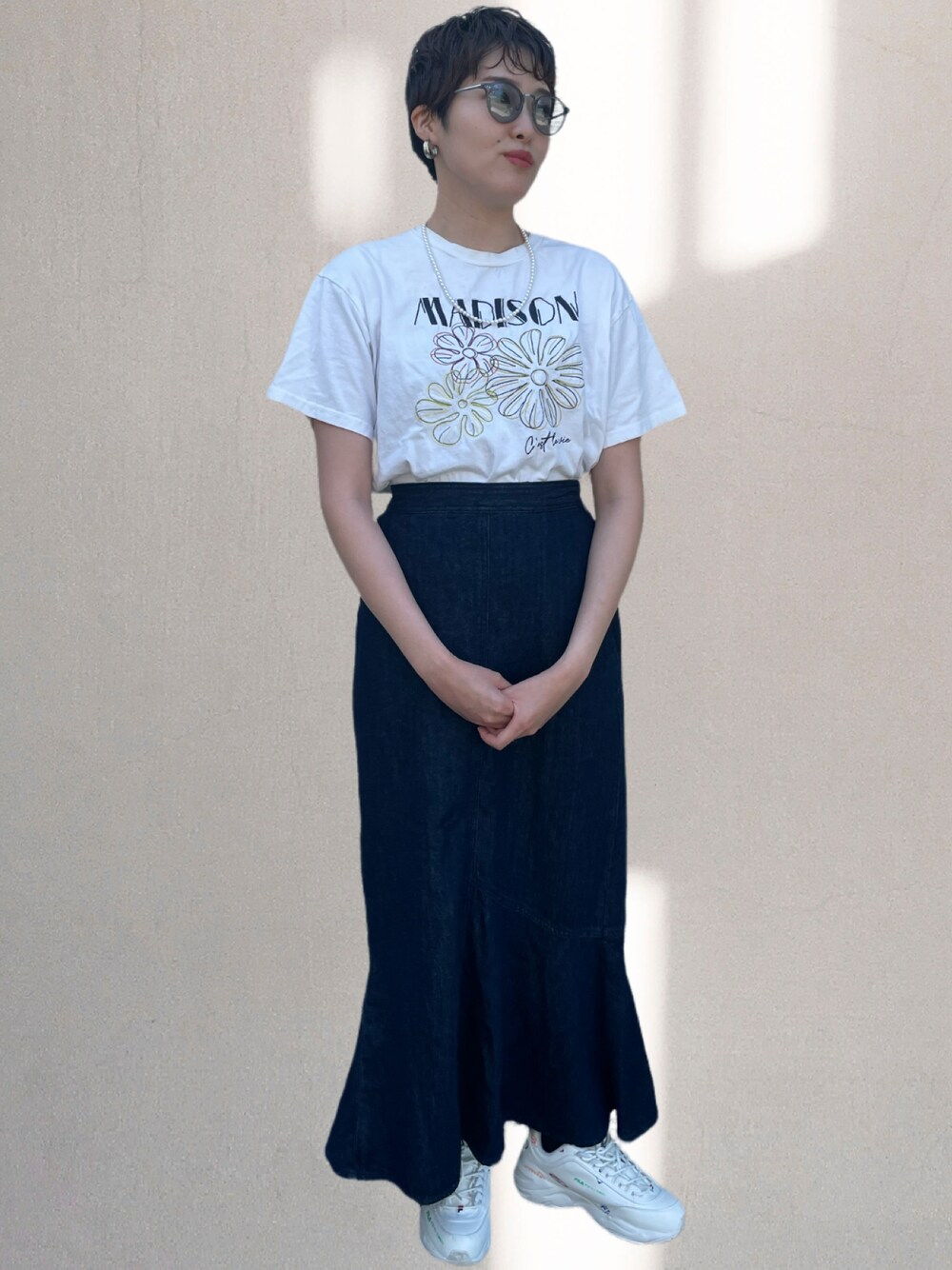 デニムスカートにロゴTシャツでカジュアルですが、パールネックレスで綺麗め感アップ! その分他の小物で外しました!