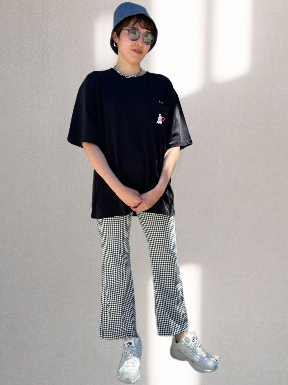 メンズの張り感のある生地のTシャツをフレアパンツでレディースに寄せました! バケハで視線を上にしたのもポイント♡