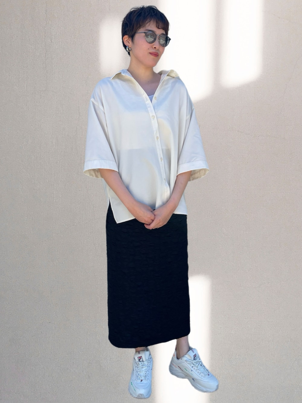 ゆるシャツにタイトスカートで大人感! 足元はスニーカーで抜け感プラス!