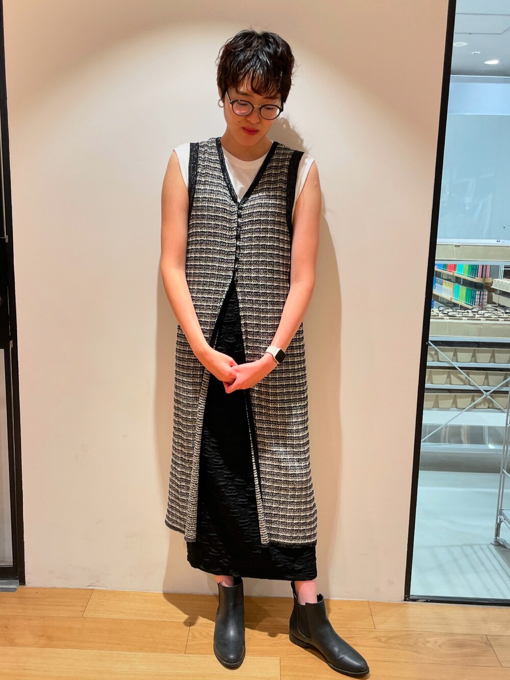 デパコス見に行くので、キレイめなジャガードチェックのジレにタイトスカート合わせ! 暑くても、柄からなら秋を取り入れやすいです💓