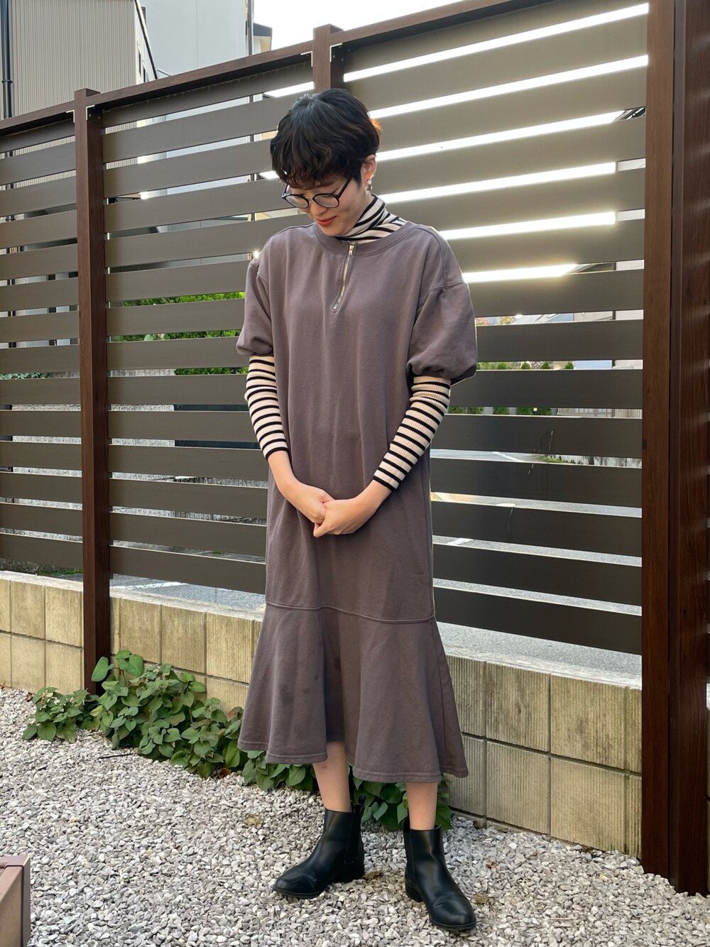 chocoのワンピース「【低身長向け・高身長向けサイズあり】袖ボリューム前後2WAYマーメイドスウェットワンピース」を使ったコーディネート