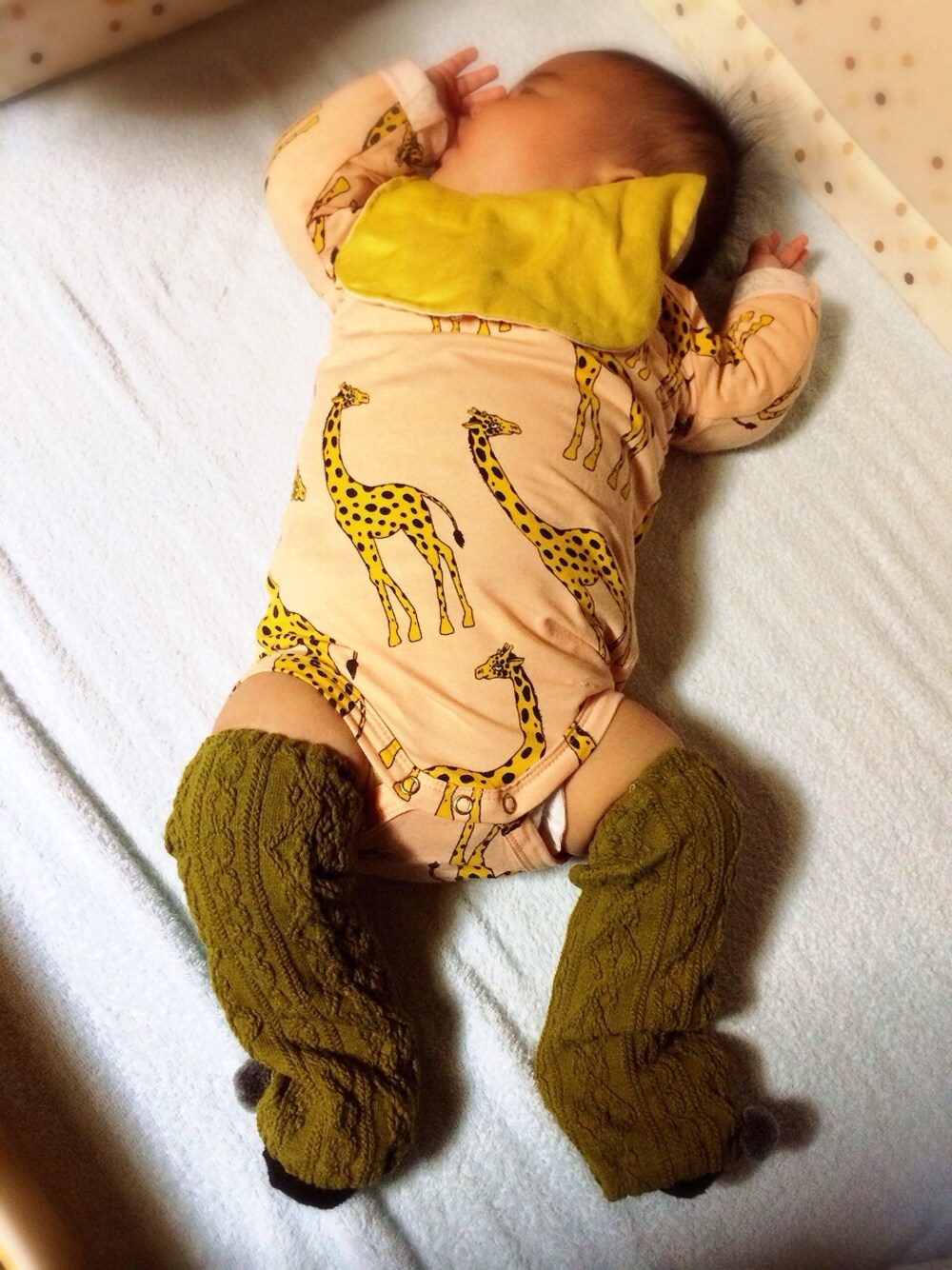 mini rodiniのロンパースのキリンが可愛い♡ オムツはみ出ちゃった( *´艸`)w ロンパース : mini rodini スタイ : クーベルチュール レッグウォーマー :toitoitoi!