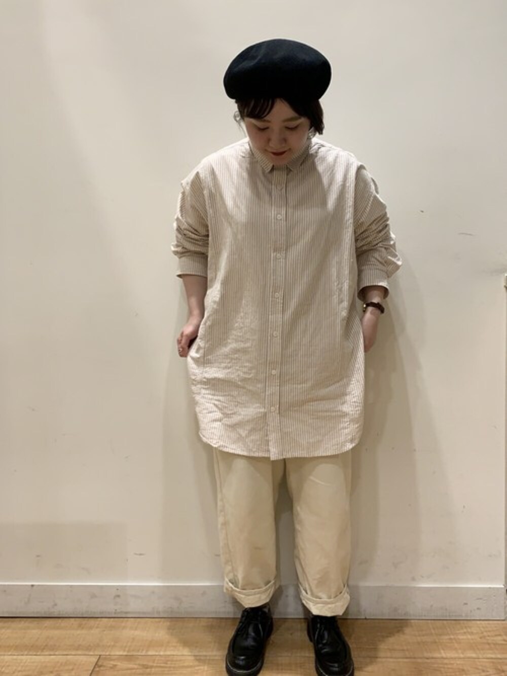 ゆったりなサイズ感のオックスフォードシャツは 男性も着用可能です♩ 小物を黒でまとめて少しメンズライクに。