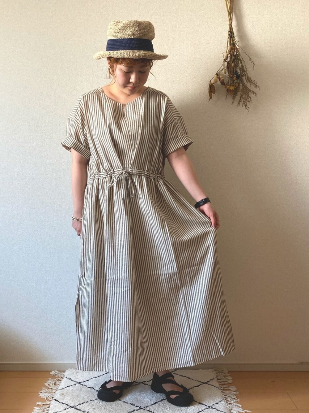 カザマキのワンピース「リネンコットンストライプスキッパーワンピース」を使ったコーディネート