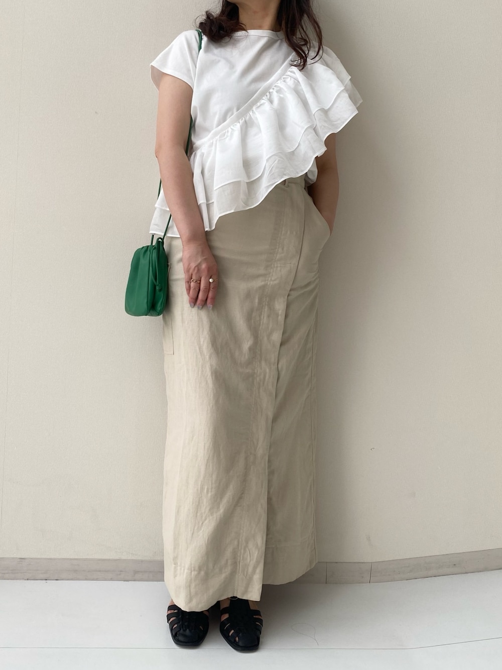 今流行りのフリル衿を重ねたTシャツ。アラフィフなのでロングスカートでちょっとキレイめにまとめました。 フリルがちょっと恥ずかしい…と臆するなかれ、このフリルが体型もカバーしてくれて、Tシャツ1枚だとなんか普段着になる…という大人世代こそぴったりなアイテムです!
