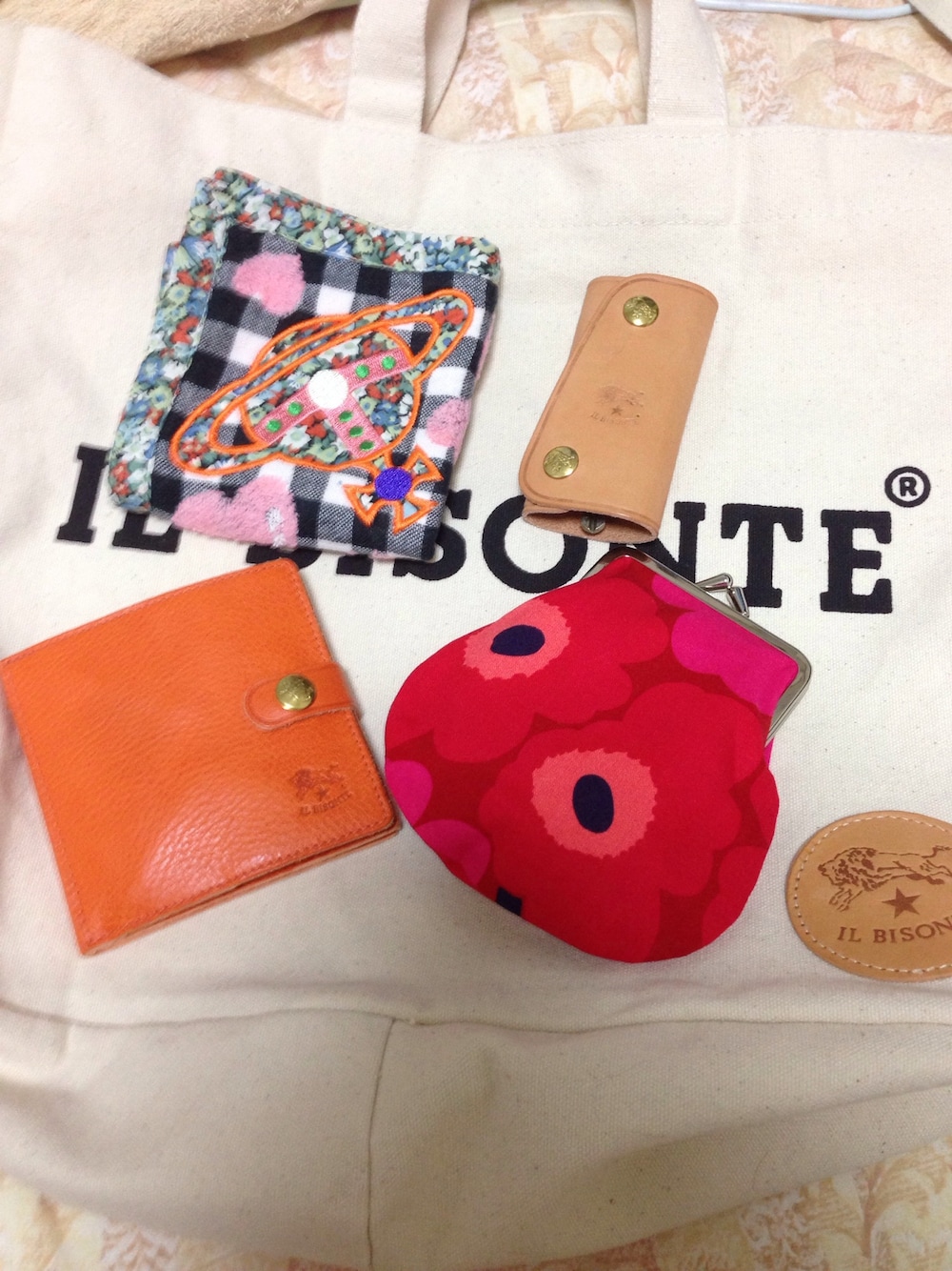 お初のせ♡ バッグの中身は少なす。 財布@IL BISONTE キーケース@IL BISONTE ポーチ@marimekko ハンカチ@Vivienne Westwood