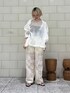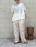 淡色ワントーンなスタイリング🤍 《ブラウス》 シアーの涼し気なブラウス。 薄手のリネンは夏にも着やすく、冷房や日焼け対策にも長袖は重宝します🎶 今回中に黒を着ているので目立っていますが、ベージュや白いインナーを合わせて透け感を控えめに着るのも◎です 《パンツ》 レースのパッチワークが可愛いです。 脚が透けますが、形がわかりづらい程度なので着やすいです。 Tシャツでもサマーニットでも…トップスは何を合わせても可愛いです。 ┈┈┈┈┈┈┈┈┈┈┈┈┈┈┈┈ Instagram:___m073___ オンラインでお買い物していただく際に、少しでも商品の良さやサイズ感、素材が伝わりやすいように心がけております。 お役に立てたら嬉しいです。 Instagramのフォローもお気軽によろしくお願いいたします。