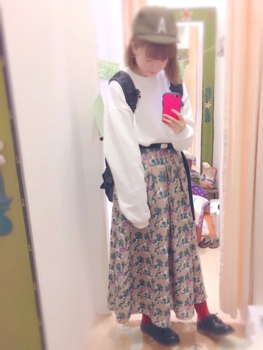 👗💜💗👗💜💗👗💜💗👗 今日は花柄スカートでカジュアルにコーデ組んでみました🌸🌸 足元は赤い靴下を合わせるのめっちゃ好きです☺🙌❤ ビックスウェットはguでメチャ安かったので2色買いしました🍇裏起毛であったかいし使いやすくてプチプラコーデにオススメです~🍠
