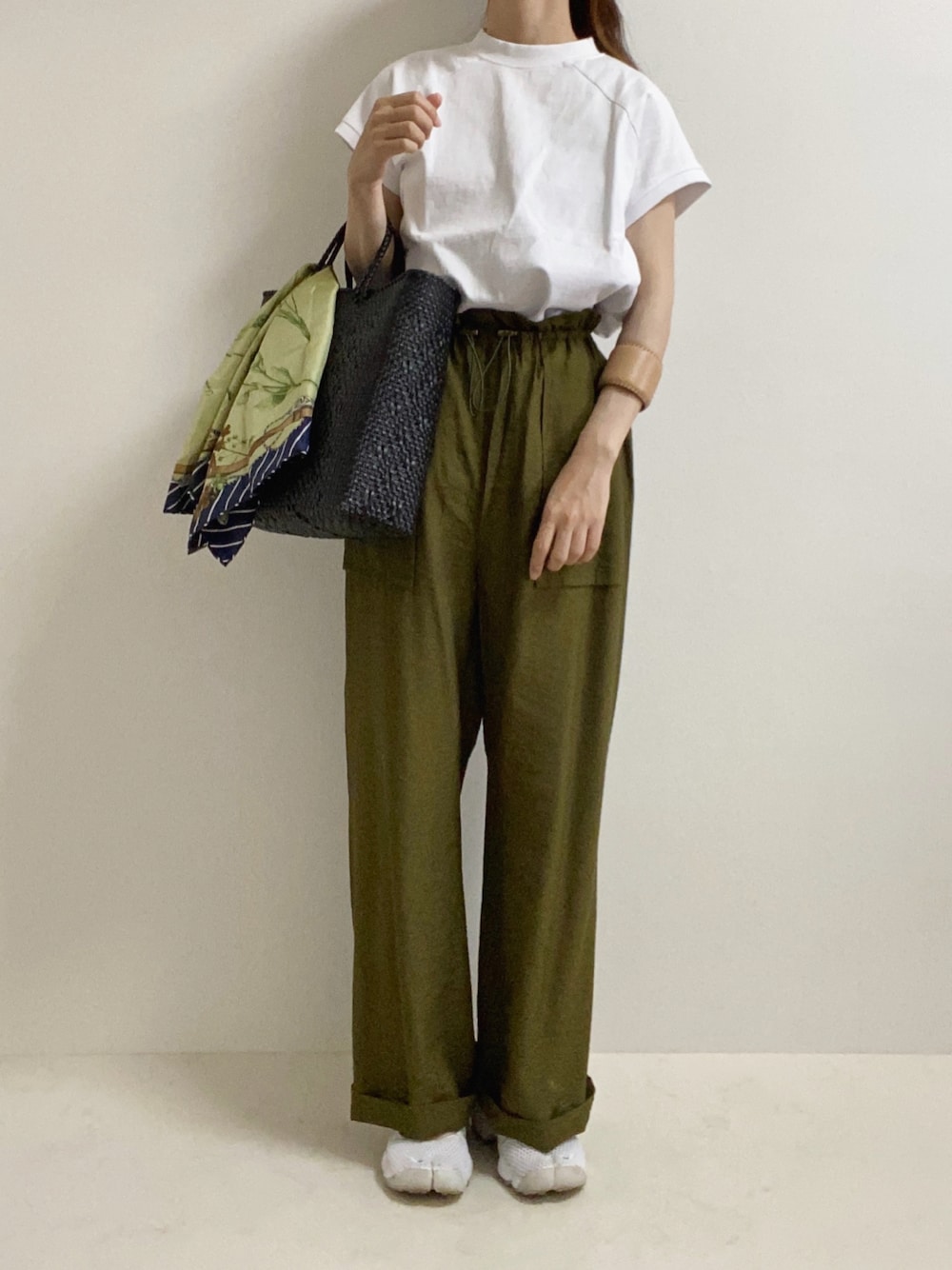 スカーフの色味をパンツに合わせて