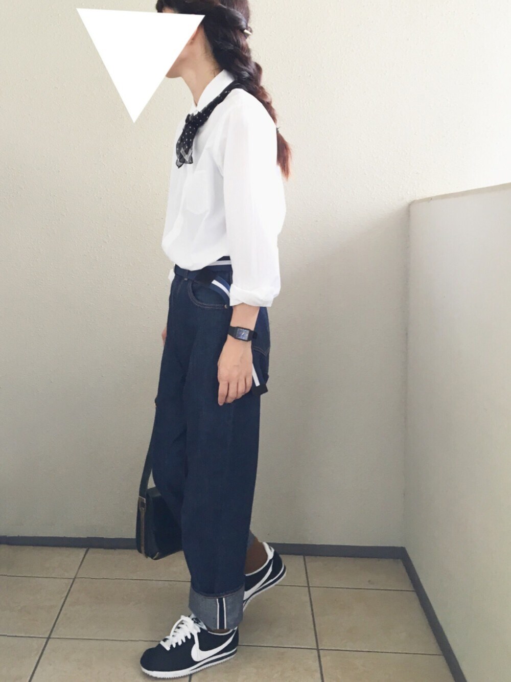 きっちりスタイルを テープベルトとスニーカーで カジュアルに。 Instagram → cho_co_roo