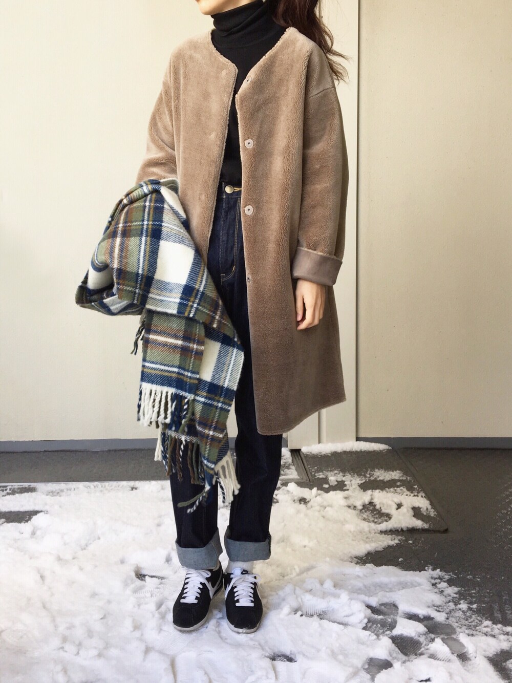 Chocorooのムートンコート「フェイクムートンノーカラーコート_#」を使ったコーディネート