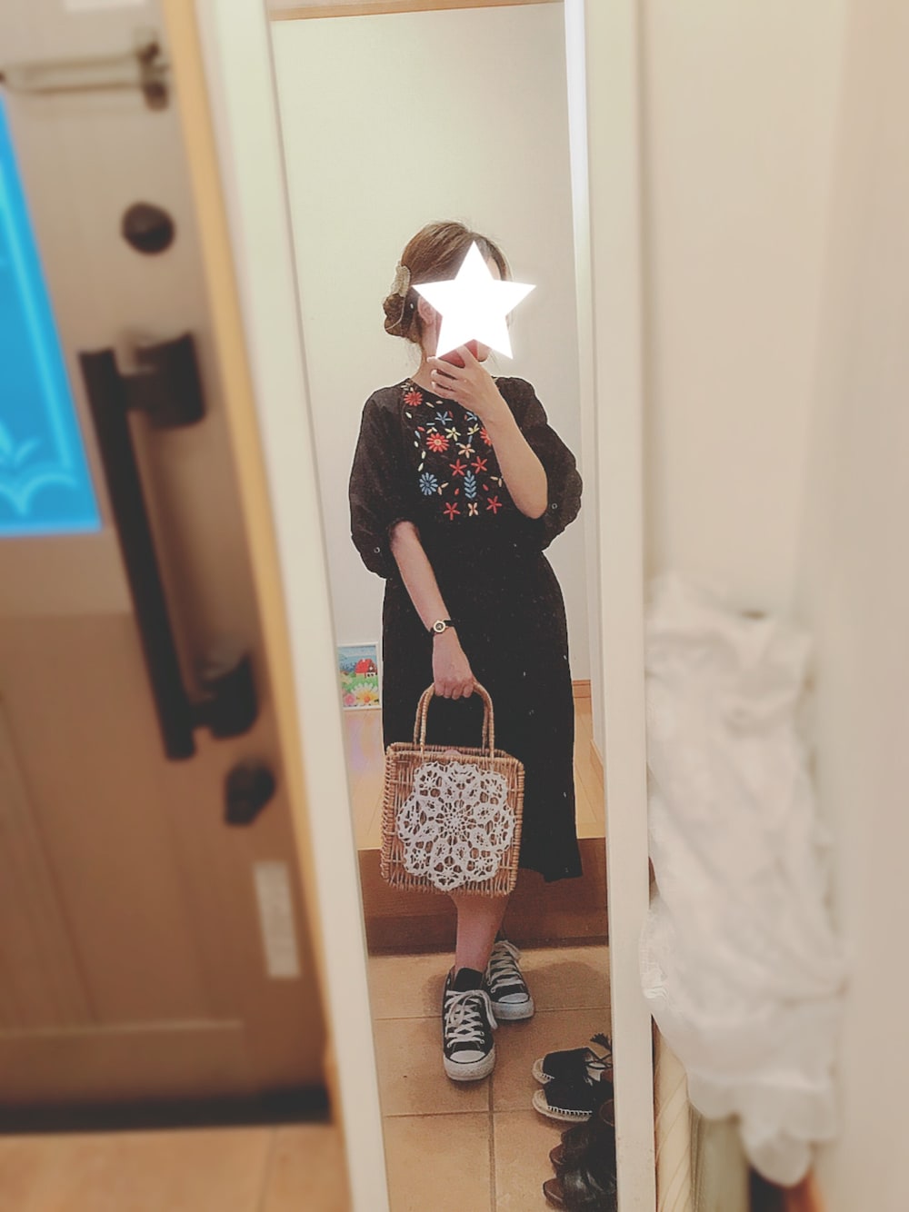 いつかの出勤スタイル🌼 ワンピースの刺繍✖️カゴバッグの刺繍 甘すぎないように足元はスニーカーで👟