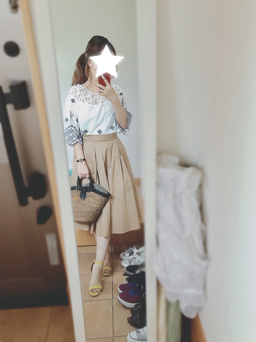 いつかの出勤スタイル👗 肩がレースになったトップスは涼しいし、 可愛い😍 イエローサンダルをアクセントにしました。