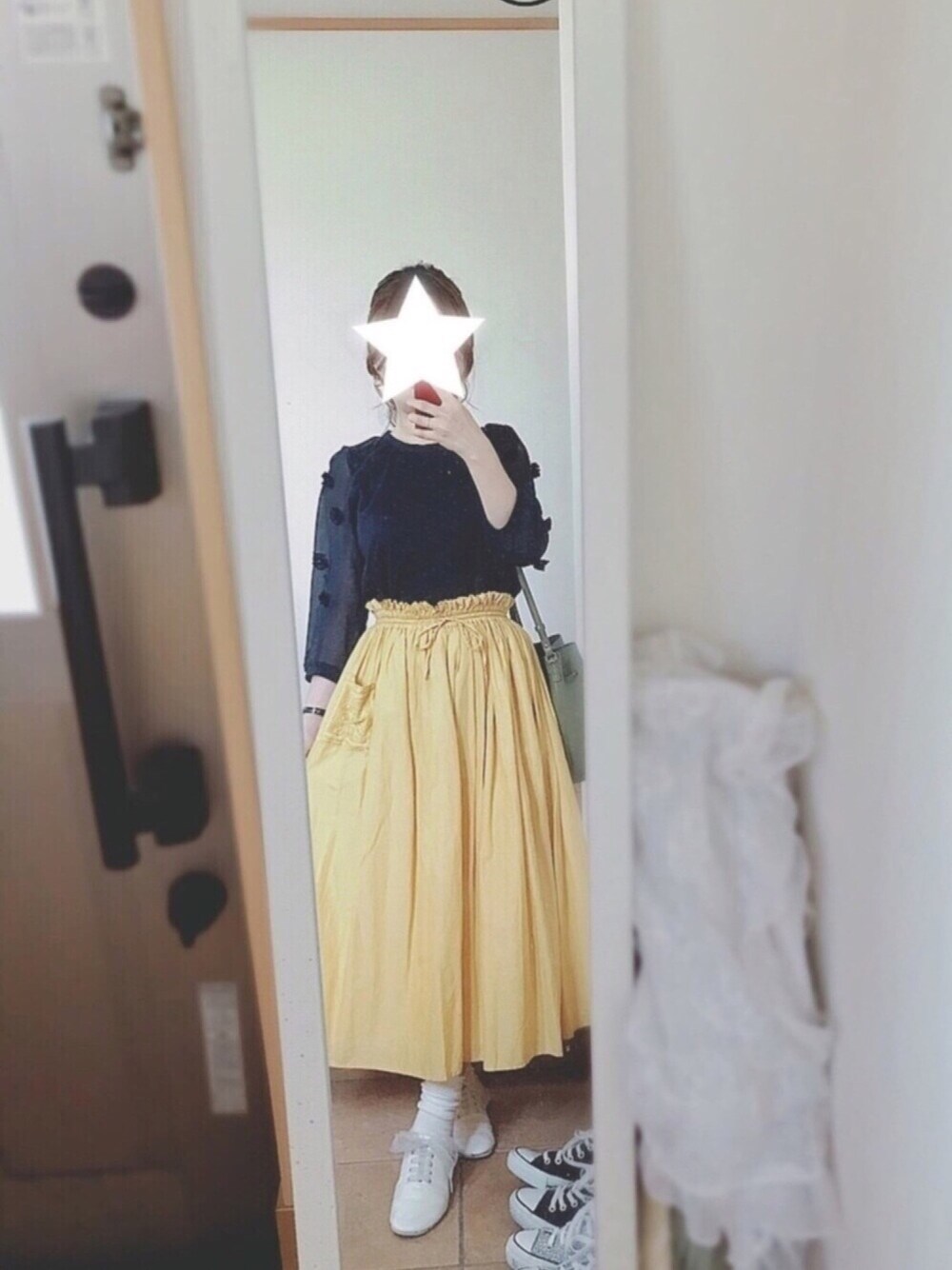 出勤スタイル🌸🌷 ネイビー✖️イエロー この組み合わせが好きです💓 トップス:肩から腕にかけて透けていて、小さいお花が付いています。3000yen スカート:ポケットのさりげない刺繍がお気に入り。 どちらも何年も前に買ったものですが、 好きなので気にせず着ています💨