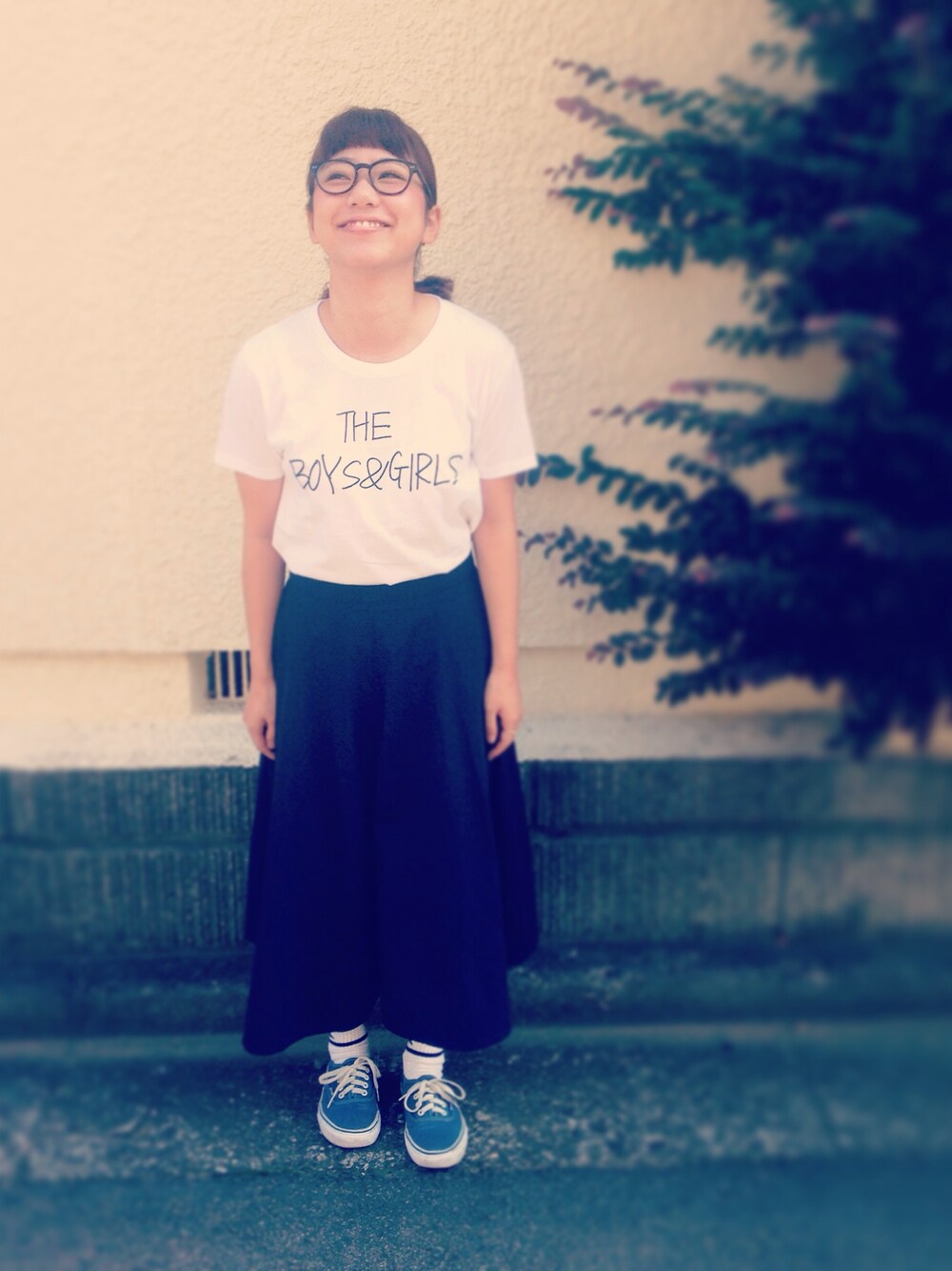 だいすきなバンドの初公式Tシャツ とっても幸せな気分です 暑いので髪の毛をまとめてみました Tシャツ:THE BOYS&GIRLS(バンT) スカート:GLOBAL WORK クツ:VANS メガネ:JINS(度入り)