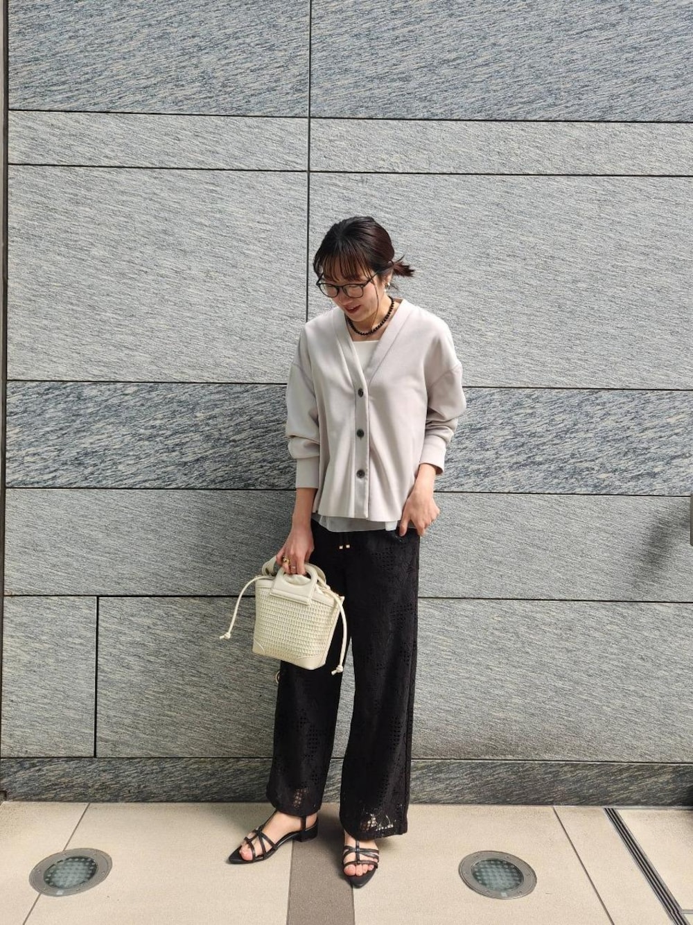 30代/ 167cm / 骨格ウェーブ / 普段サイズM / 【サテン×スムース裾チュールタンク】 サイズ感:ちょうどよい 素材感:光沢があってつるつるしている 着用感:胸元がそんな空きすぎなくて着やすいです‼裾がチュールでレイヤードするときにポイントになって可愛い◎ 【カットジョーゼットカーデ】 サイズ感:ゆるめのシルエット 素材感:少し生地感厚めで透け感なし、柔らかい 着用感:裾が前後長さが違うので、色んなボトムが合わせやすい◎ 袖口がゴムでたくしあげた時落ちてこなくて優秀なカーデです‼ 【レースイージーワイドパンツ】 サイズ感:ちょうどよい 素材感:レースがしっかりしている、生地しっかりめで透け感なし 着用感:裏地が少し短めなので、足の甲が見えてすっきりシルエットに◎ウエスト紐で調節可能なとこも◎ 【メッシュ2wayトートバッグ】 サイズ感:小さめ 素材感:春夏っぽい可愛いトートバッグ 着用感:小さめだけど、縦にも高さがあるので小さめペットボトルなどの飲み物も入ってお出掛け用に最適◎