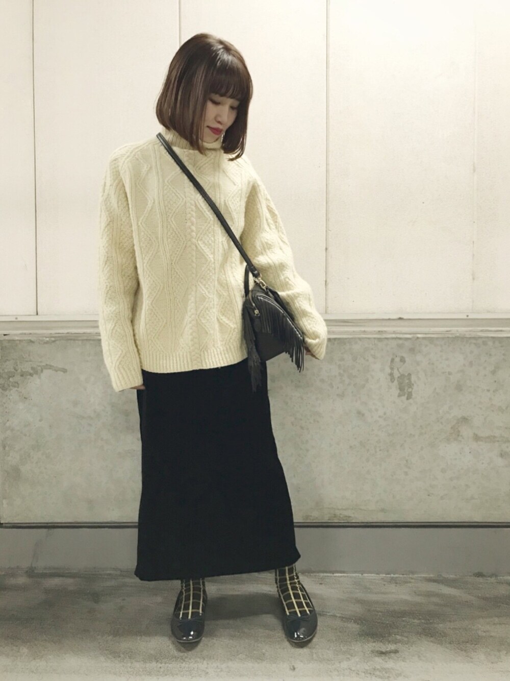 ホワイト系のニット/セーター、ブラック系のワンピース、その他のバレエシューズを着用したレディースの冬コーディネートの1枚目の写真