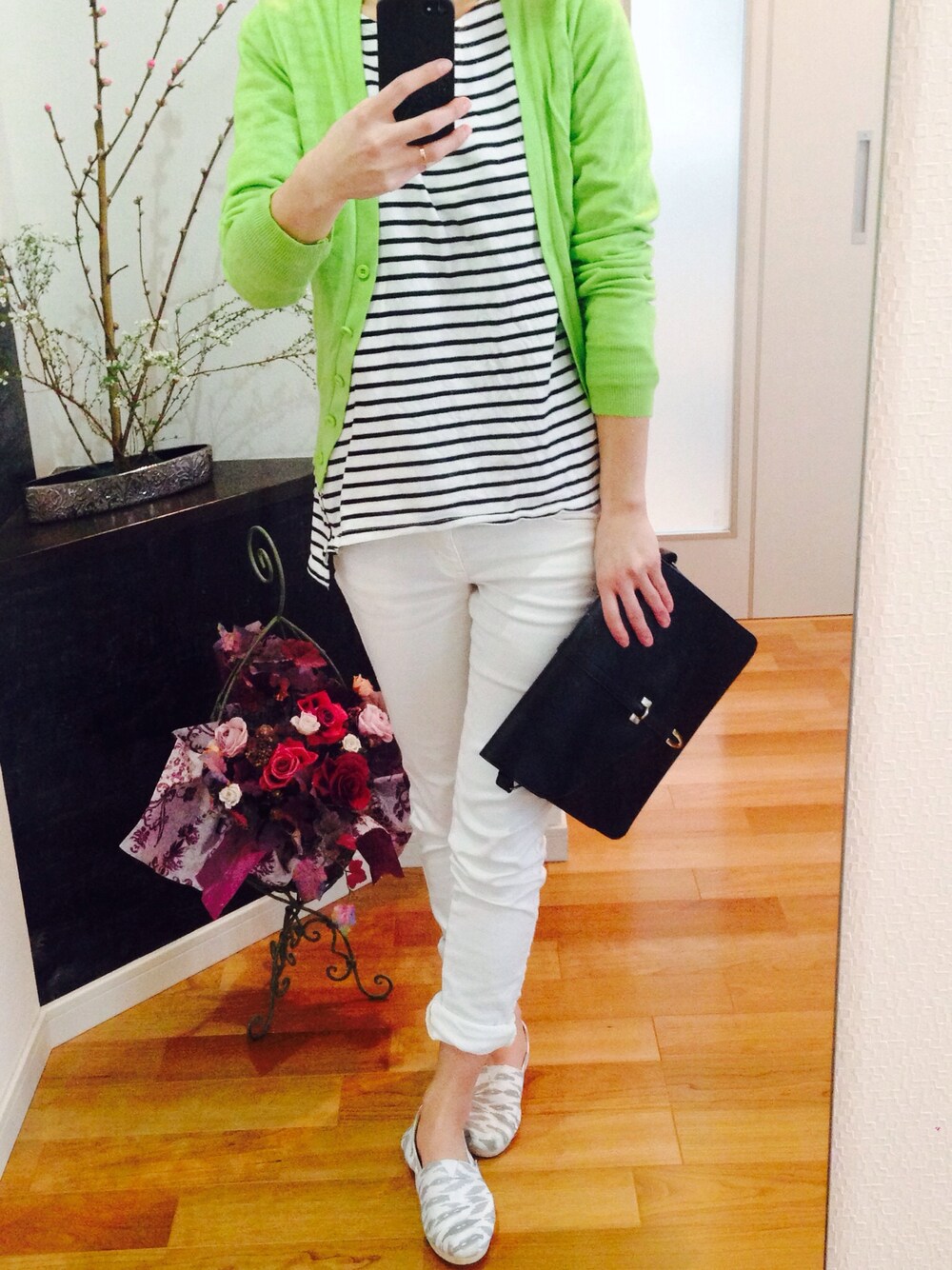 ボーダーシャツ、カーディガン、バックーdholic 靴ーTOMS ちょっとお茶しにスタイル