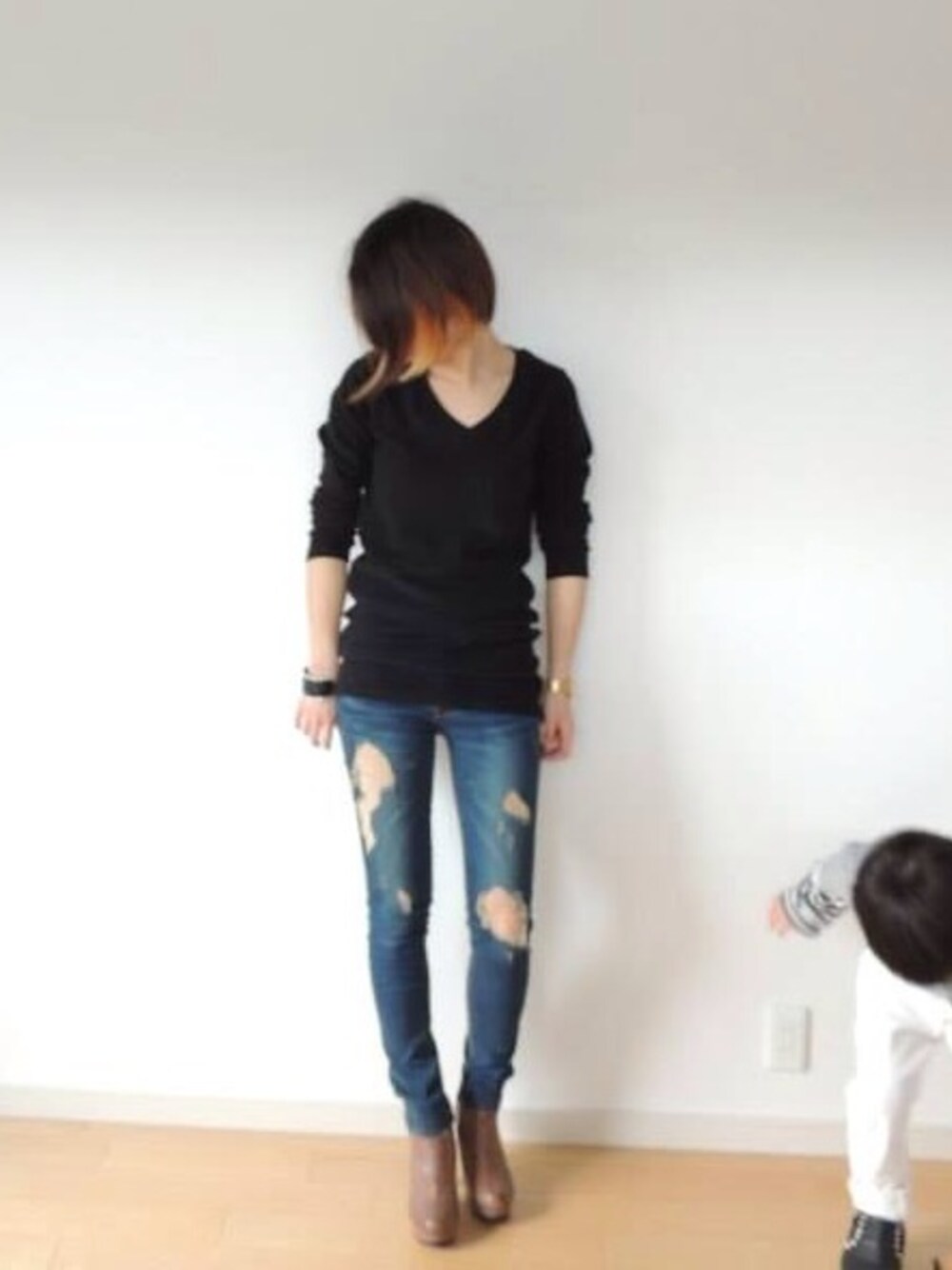 Vネック&スキニーで着やせ ブールをパンツにインするのが好き