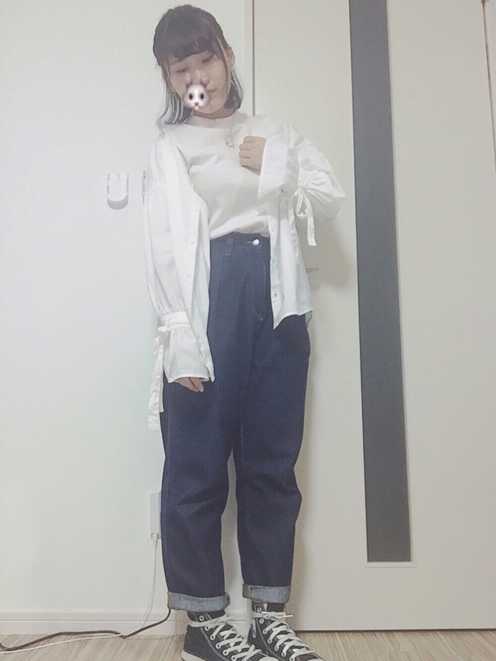 シャツを羽織として着てみました👶🏻 ジーナの白シャツ着回しきいて 本当にお気に入りです💓 朝夜は寒くてコートいりますかね😢😢 今日のポイントはコンバースの靴紐を 結び方にアレンジ効かせたことです♡